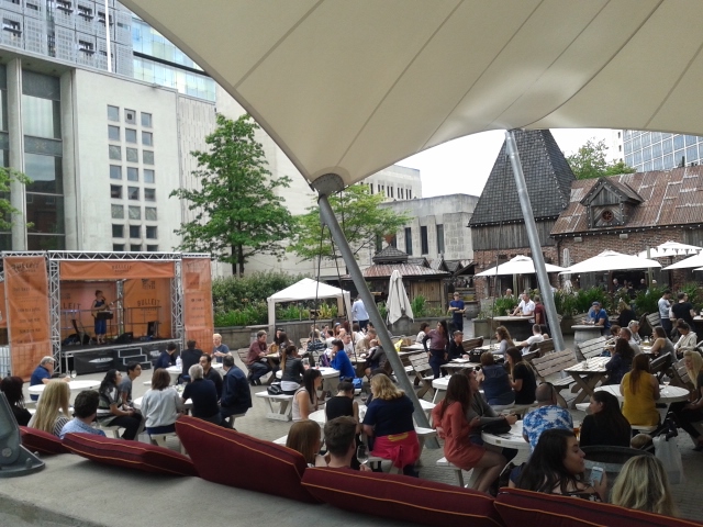 Ao final do passeio (“The Avenue”), tem o (12) Crown Square, uma imensa área aberta (tipo um beer garden) com uma coberta tensionada. Tinha uma moça cantando lindamente lá. Estava muito agradável! Por mim, eu sentava ali, pedia uma pint e ficava.
