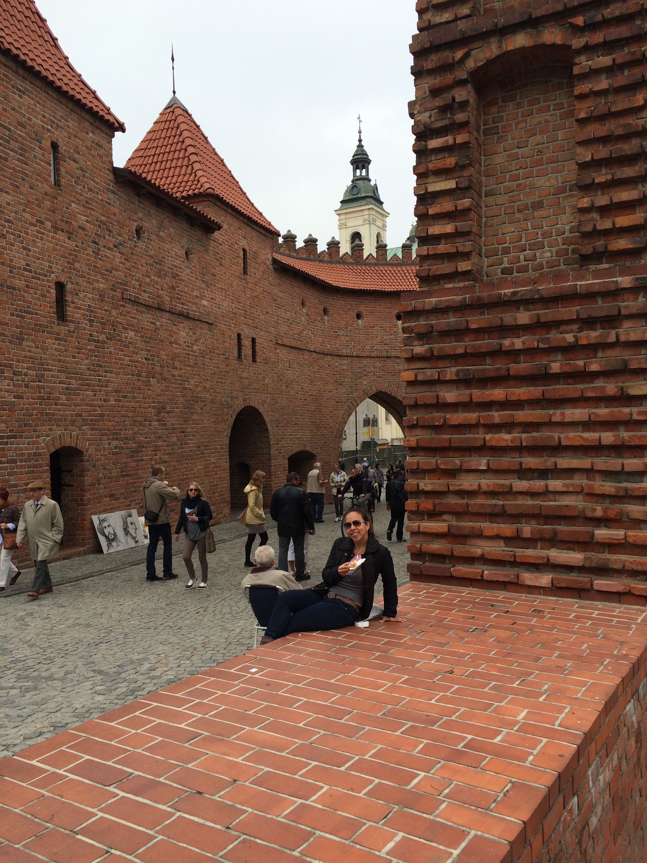 No dia seguintes, saímos logo cedo, pois nosso ônibus para Cracóvia era às 13:00. Fomos caminhando para a cidade velha. Tinha um free walking tour pela Cidade Velha às 10:30,mas não dava tempo. Fiz o mesmo caminho do dia anterior, sendo que fomos ainda ao Barbican(17), onde tem os resquícios da antiga muralha da cidade e da torre de proteção.