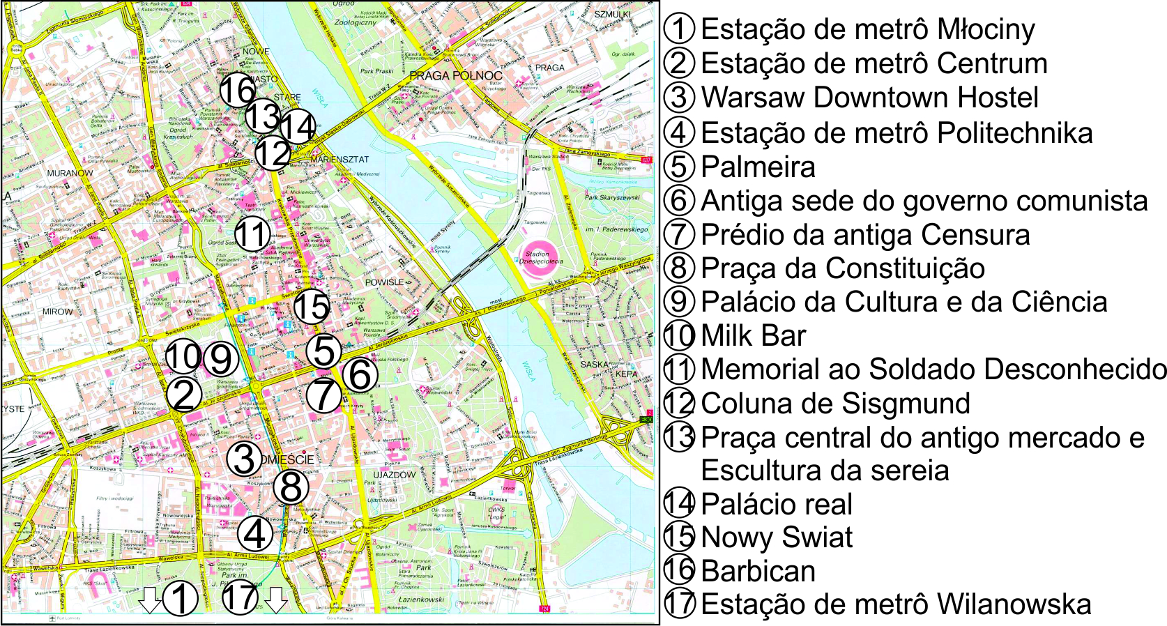 Chegamos em Varsóvia às 6:50 da manhã, mas o ônibus da Polski não chega na rodoviária e sim na estação de metrô Młociny(1). De lá, peguei o metrô até a estação Centrum(2) e caminhei até o Warsaw Downtown Hostel(3). Estava muito cedo para o check in, mas eles me deixaram tomar café da manhã, tomar banho e guardar minha bagagem. Esse hostel é pequeno, mas bem legal e os funcionários são muito prestativos. Ficamos em um dormitório feminino com banheiro privativo, cuja diária custou 68 zlots poloneses, o equivalente a €17. O forte dele é a área de convívio: sala de estar bem aconchegante, com livros e jogos de tabuleiro; sala de jantar, onde os hóspedes se juntam a noite para saborear as comidas oferecidas pelo hostel e interagir um pouco; e cozinha, onde as pessoas podem preparar suas refeições e onde o café da manhã (muito bom, por sinal!) é servido. Só achei que ele fica um pouco escondido, dentro de uma vila. Fica entre as estações de metrô Politechnika(4) e Centrum e a caminhada para o centro histórico leva cerca de 30minutos.