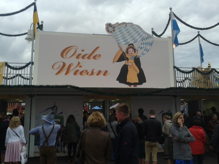 Bom, era o único traje que tinha e era com ele que eu ia mesmo! Tomamos café no supermercado e fomos para a festa! Passeamos pelas barraquinhas, comprei uns presentinhos e fomos encontrar Kerstin, seus filhos e seus amigos no “Oktober Velho”. Isso mesmo! Muita gente não conhece, mas tem uma parte da festa onde eles reproduziram o parque de diversões e as tendas do Oktober antigo, é a “Oide Wiesn”. A entrada custa €3 e o lugar é ideal para quem vai com a família, pois é bem mais sossegado e tranquilo para as crianças. O parque tem brinquedos antigos, como carrossel e tiro ao alvo, e algumas poucas tendas. Entramos na tenda da Höfbrau, que tem um espaço central reservado para apresentações de dança e para ser usado como velódromo, para corridas e apresentações de bicicleta, incluindo algumas bem diferentes. É um lugar mais agradável para almoçar, inclusive, apesar do preço da comida ser bem salgada! A cerveja é servida em caneca de louça! Adorei a experiência!