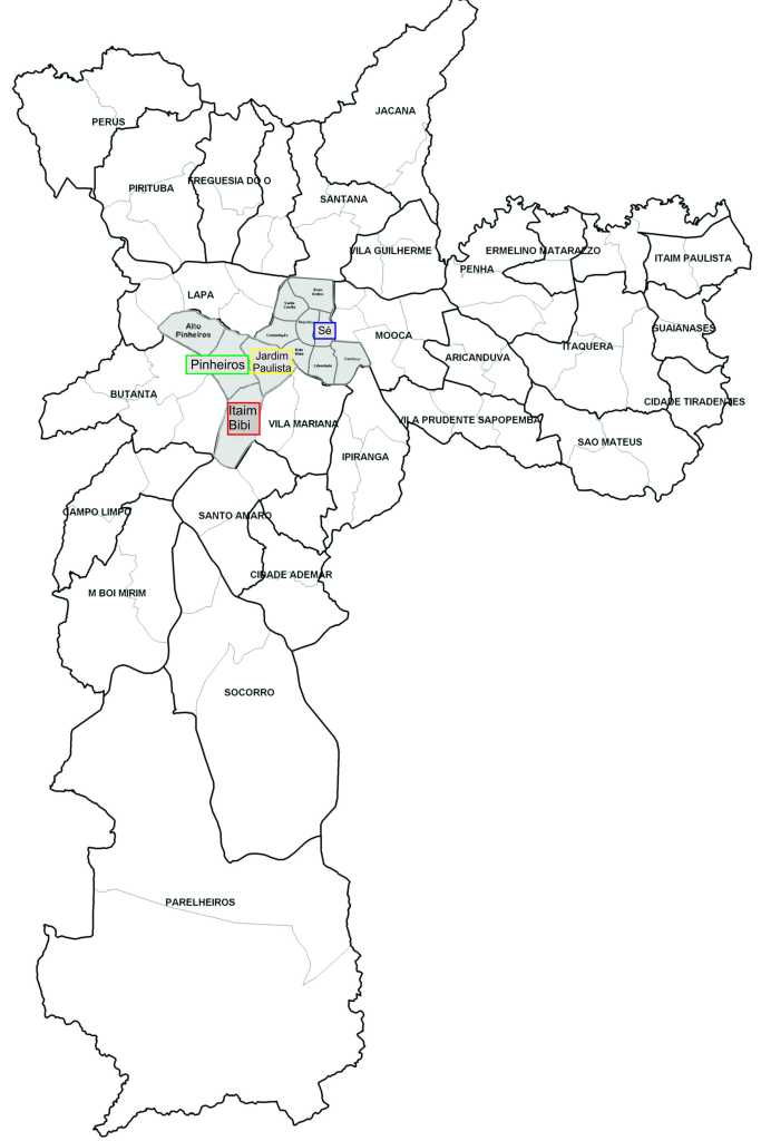 Mapa das subprefeituras de São Paulo, destacando as de Pinheiros e Sé, por onde andei