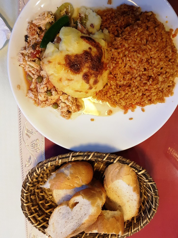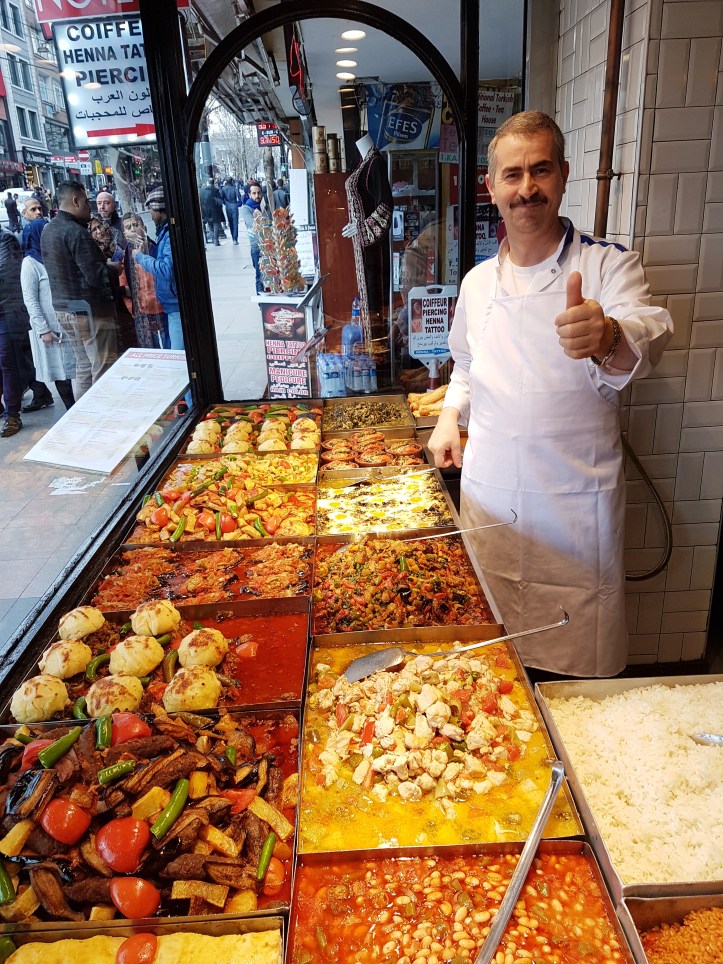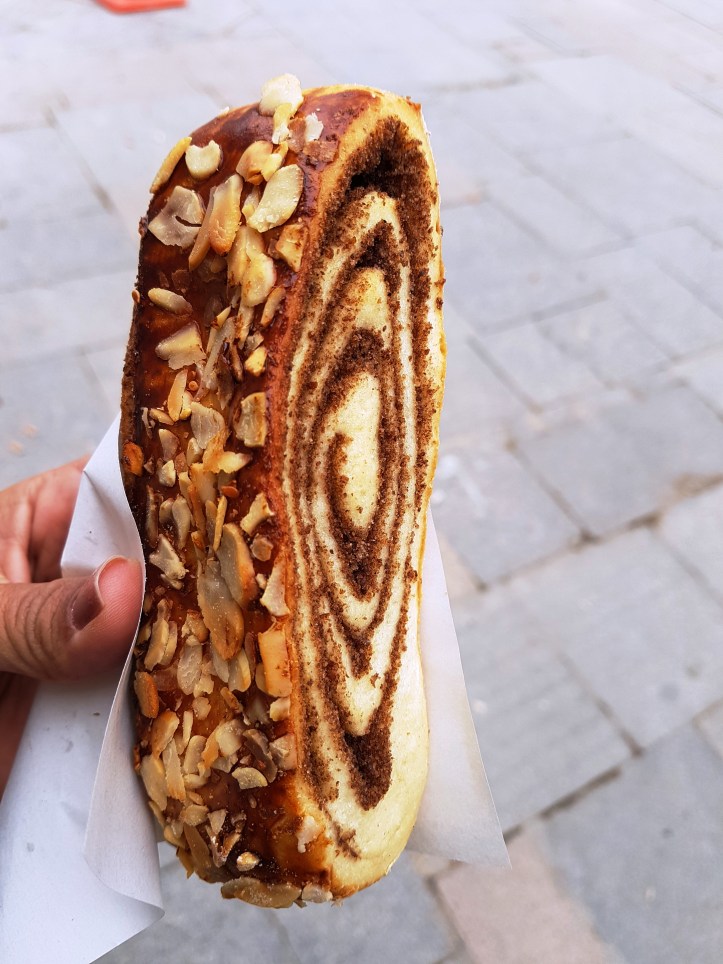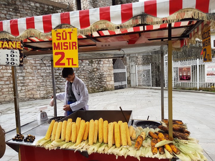 E foi em um desses restaurantes que almocei, no Baran Ottoman Restaurant. A vitrine foi Mega convidativa e a simpatia do cozinheiro também! Pedi um frango desfiado que vem com purê de batatas (14TL) e completei com um arroz turco (6TL). Estava uma delícia e bem farto! Eu nem estava com tanta fome, pois havia provado um doce feito de pão intercalado com canela e coberto de nozes (3TL) que comprei em um dos carrinhos de lanche na rua. Junto às atrações turísticas sempre tem carrinhos de lanches, principalmente vendendo milho assado, noz assada e pretzel. Sou apaixonada por comidas de rua e não podia deixar de provar as turcas!