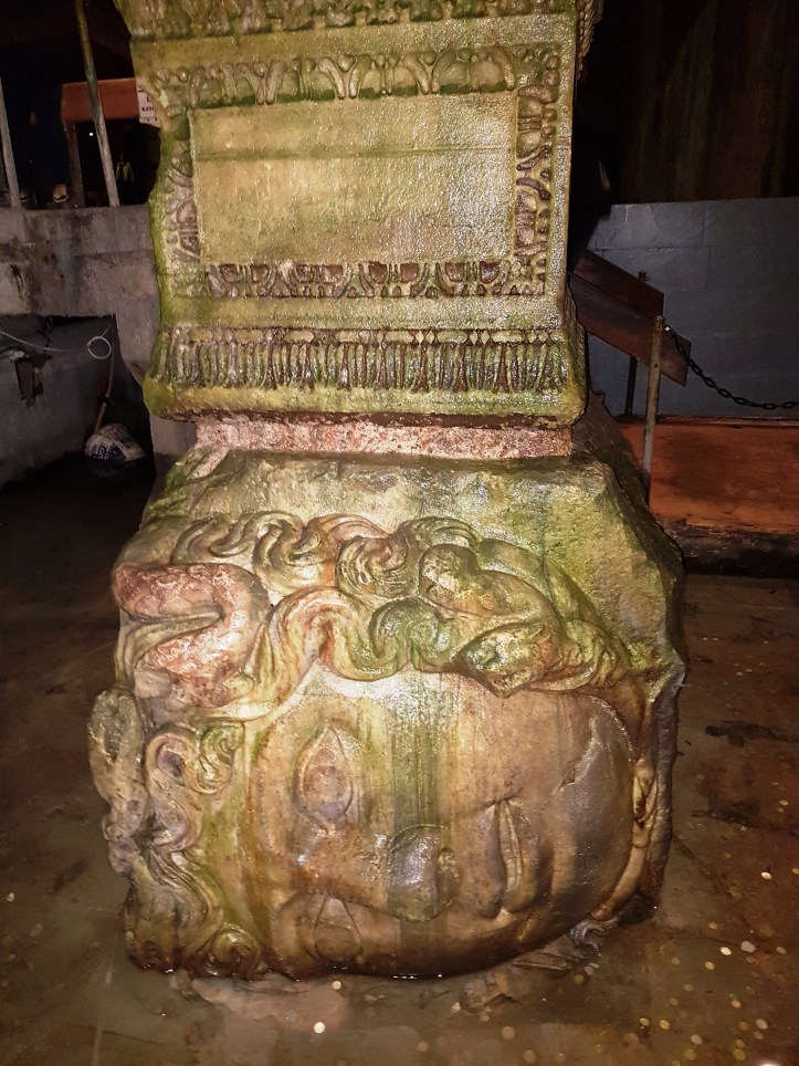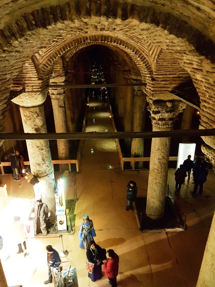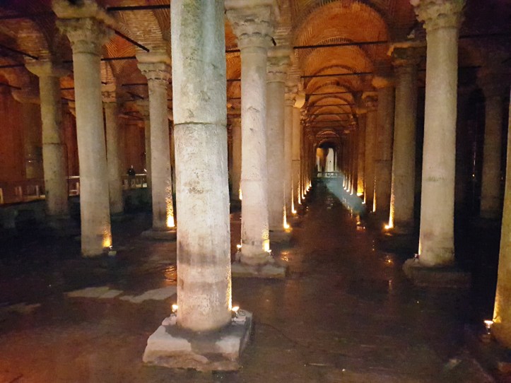 - Cisterna da Basílica de Santa Sofia – ela está desativada enquanto cisterna, mas está aberta à visitação. Seu acesso é independente da Basílica, assim como o ingresso, que custa 20TL. A entrada fica em outra rua, mas bem perto da Basílica. É repleta de colunas, com destaque para duas que possuem a cabeça da Medusa em sua base. Apesar de as pessoas que me deram dicas de Istambul não recomendarem a visita à Cisterna, pelo meu curto tempo na cidade, resolvi ir, pois, no voo para Istambul assisti ao filme Inferno, com Tom Hanks, e o final acontecia justamente lá! Tinha que ver de perto! Não me arrependi! Mas pode ser que, para os que não trabalham com Arquitetura/ Engenharia e para aqueles que não assistiram ao filme não seja um passeio interessante.