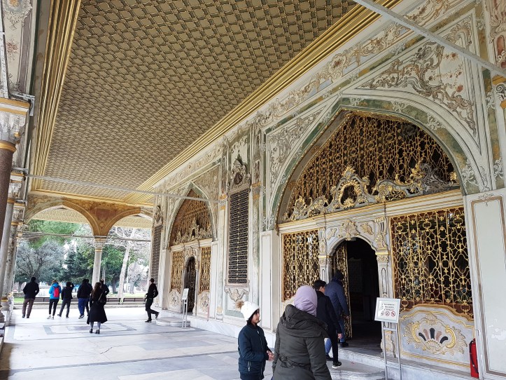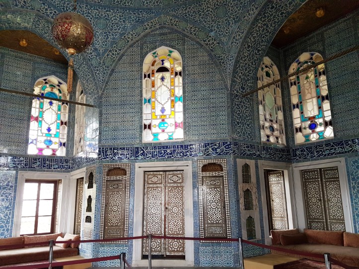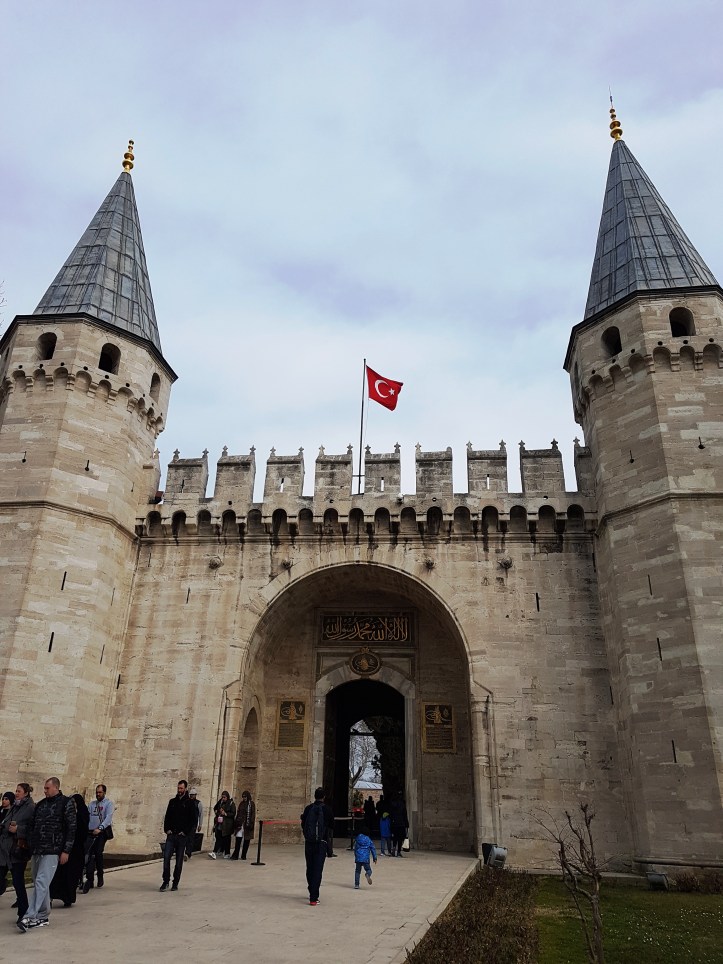 - Palácio Topkapi – era a residência dos antigos sultões turcos, tendo inclusive a parte do Harém, onde ficavam as dezenas de mulheres do sultão. Hoje funciona como museu. É imenso! Tem ainda uma linda vista para o Estreito de Bósforo, que divide a parte européia da cidade da asiática. Inclusive, tem um restaurante estrategicamente localizado para observar a vista. A riqueza pode ser observada na grandiosidade do Palácio e nos detalhes, principalmente nos revestimentos em mármore, ouro, cerâmicas diversas e até madre pérola! A entrada custa 40TL, mas, se quiser visitar os apartamentos do Harém, tem que pagar mais 25TL. No caminho para o Palácio, tem o complexo de Museus Arqueológicos de Istambul, mas, como meu tempo era curto, pulei esta atração.