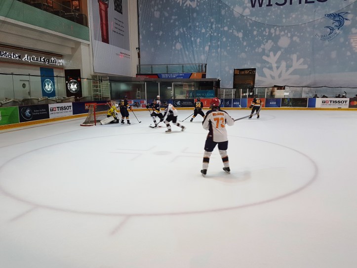 Dentro do shopping tem também uma imensa pista de gelo, onde estava tendo a prática de hóquei. Em outros horários ele é utilizado como pista de patinação no gelo.
