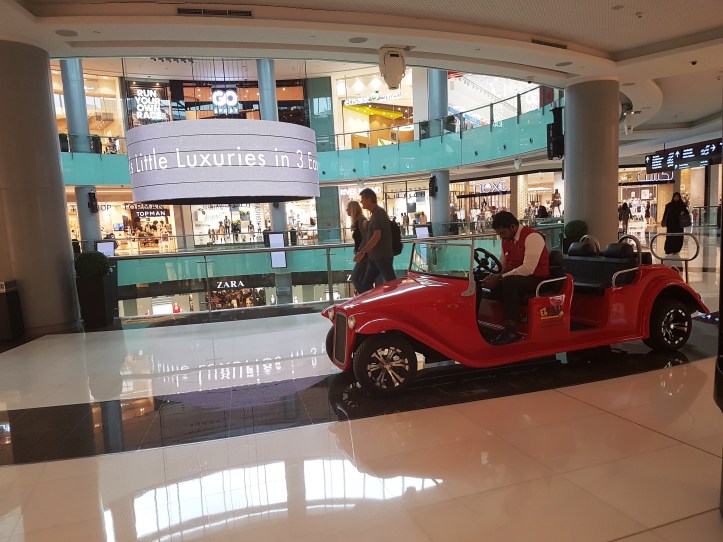 Achei bem legal essa setorização, pois o shopping é tão grande que, se ficasse tudo espalhado, ficaria difícil de fazer compras. É muito comum encontrar filas de pessoas nos pontos de informações com os mapas de localização das lojas. Mapas também são distribuídos para tentar diminuir o número de perdidos. E. para aqueles que não aguentam bater perna, existe ainda o serviço de táxi! Isso mesmo! Você pode pegar um táxi dentro do shopping para ir ao seu destino! Me perdoem, mas não perguntei o preço. Não deve ser muito baratinho não!