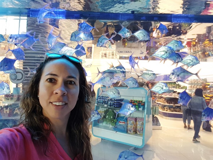 O que eu achei mais impressionante foi o gigantesco aquário com tubarões, arraias e peixes de diversos tamanhos, o Dubai Aquarium & Underwater Zoo, um zoológico submarino dentro do shopping! Uma boa parte, a vitrine, pode ser vista gratuitamente pelos clientes. Mas quem quiser explorá-lo, tem que escolher dentre as várias formas de visitação e comprar seu ingresso.