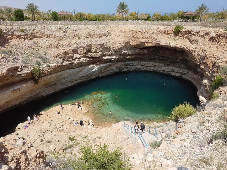 Bimmah Sink Hole – após dirigir duas horas desde Mascate (cerca de 113km), chegamos a um parque na vila Dabab, com quiosques para piquenique. Achamos estranho, pois o GPS dizia que era ali que ficava o Bimmah Sink Hole, mas só enxergávamos um parque comum. O Sink Hole fica em meio a um parqueCaminhamos mais um pouco até que, finalmente, chegamos ao tão esperado lago que fica dentro de uma imensa cratera em meio ao parque. É impressionante! Fiquei imaginando como aquele maravilha surgiu ali. Segundo uma placa no parque, existem várias histórias de sua origem, uma delas é a lenda de que a cratera é o resultado da queda de um meteoro. Tanto é que o nome do local em árabe, Hawiyat Najm, significa “A Estrela Cadente”. Já as pesquisas científicas afirmam que é consequência da interação de pedras calcárias dissolvidas que resultam no colapso da camada superficial de terra.