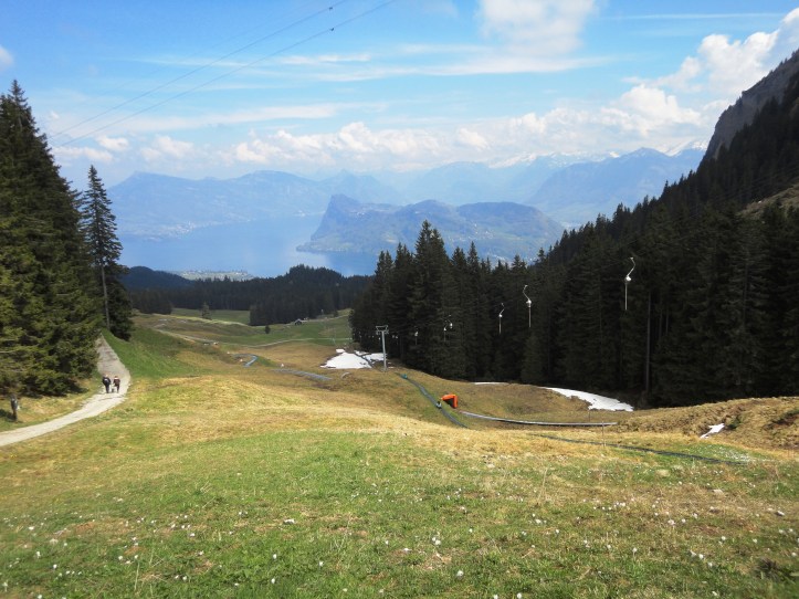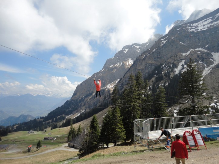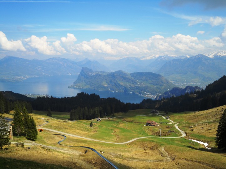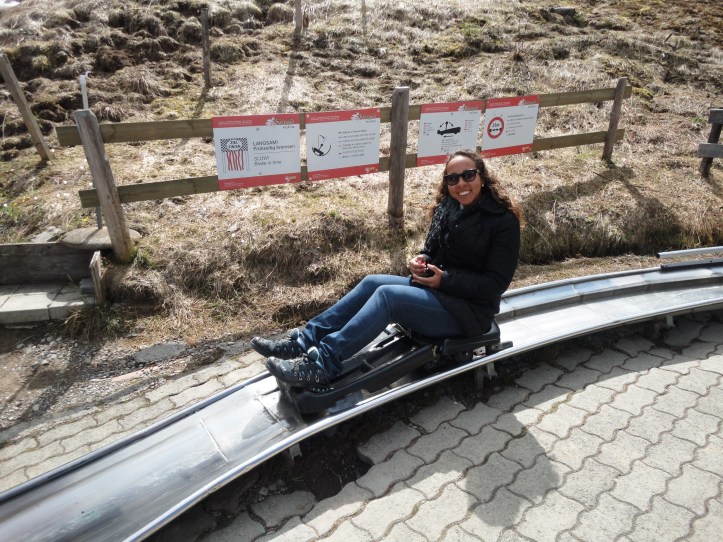 Escolhi o tobogã (CHF 8.00 = R$27,00), atração em que a pessoa desce em um carrinho com uma barra entre as pernas para frear e controlar a velocidade. A descida é bem longa, com uma vista maravilhosa! Vale muito a pena! Para subir você vai no mesmo carrinho, sendo que de ré, com um cabo te puxando. Sensacional!