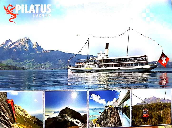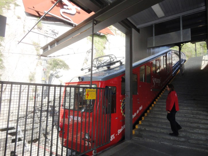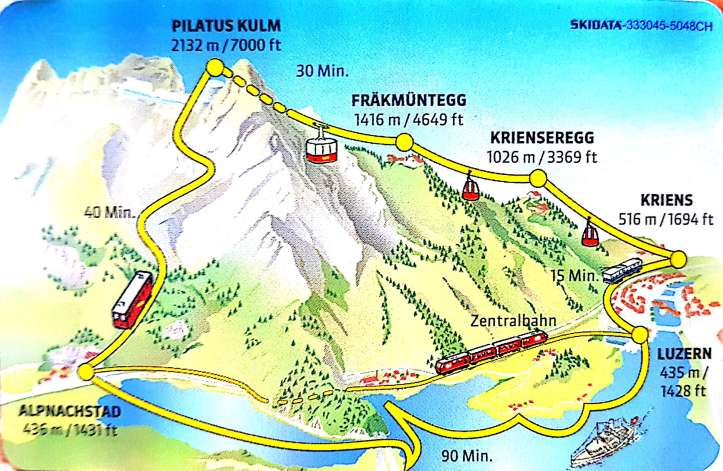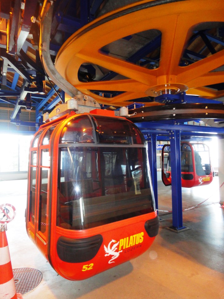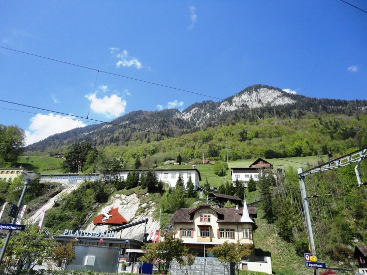 Do outro lado da estação, no Caminho de Ferro Pilatus, parte um trem que anda inclinado, chegando a 48% de inclinação, em direção ao topo do Monte Pilatus. A subida leva cerca de 40 minutos com uma belíssima vista, o que, por sinal, é uma constante por todo o passeio.