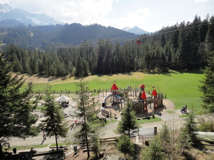 Peguei o teleférico e desci cerca de 5 minutos até Fräkmüntegg, onde têm várias opções de lazer: arvorismo, tirolesa e o tobogã. Esses não estão inclusos no pacote.