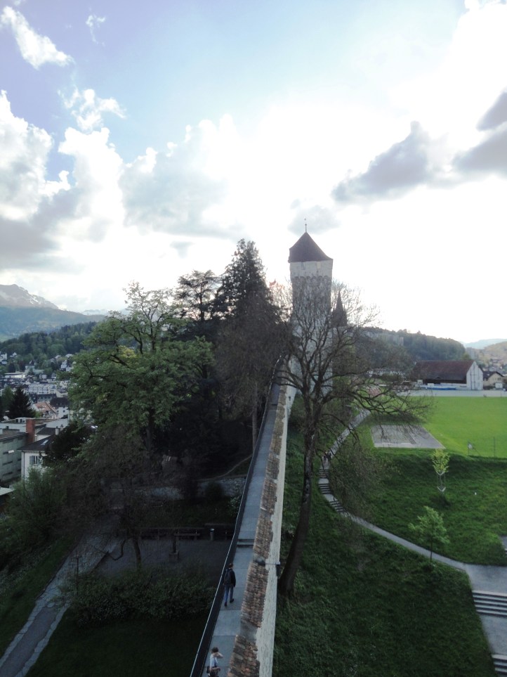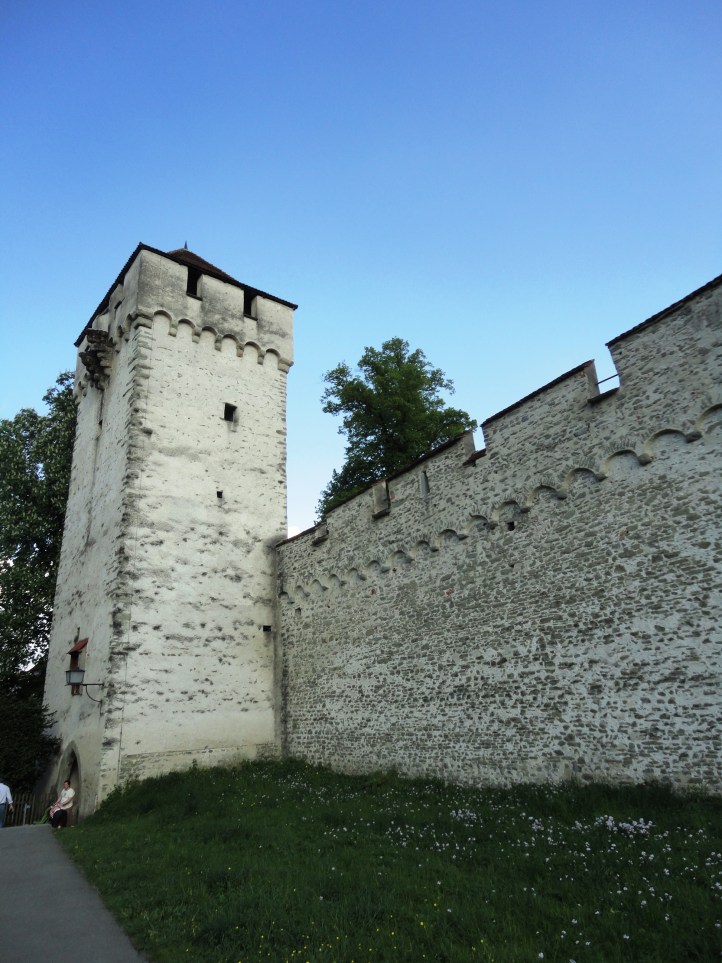 Caminhei pelas ruas da parte antiga da cidade em direção à muralha (Museggmauer), construída em 1331 e quase totalmente intacta. Subi por uma das três torres que estão abertas ao público e fui caminhando por cima da muralha em direção ao rio, descendo na última torre. Vale a pena a caminhada e também subir em uma das torres para observar a vista do lago Lucerna e da cidade.