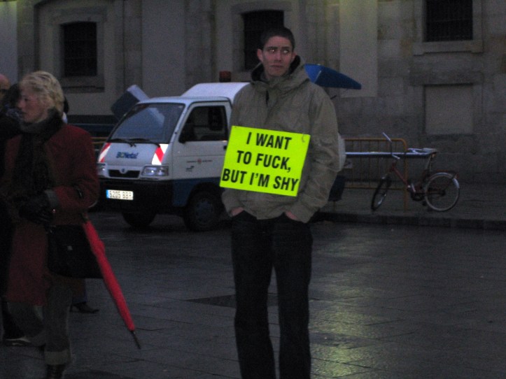 Em 2006 encontramos uma figura muito louca que estava parada em uma das praças do bairro, com uma cara de sério e uma placa pendurada no seu pescoço, com uma engraçadíssima frase escrita em inglês que dizia: “Quero transar, mas sou tímido”. Não podíamos deixar de registrar!
