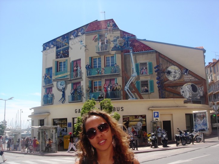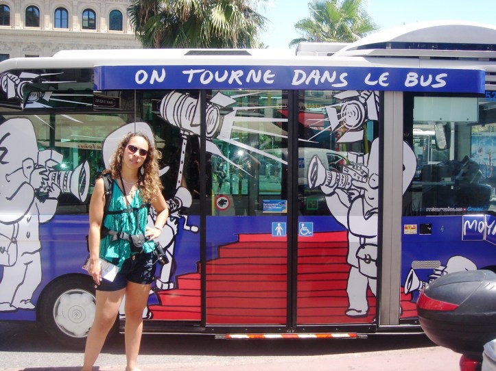 Da Estação de Trem de Cannes, fomos caminhando até a Estação de Ônibus, cuja fachada é uma atração a parte. Tanto ela quanto os ônibus são pintados com temas que fazem referência ao cinema.
