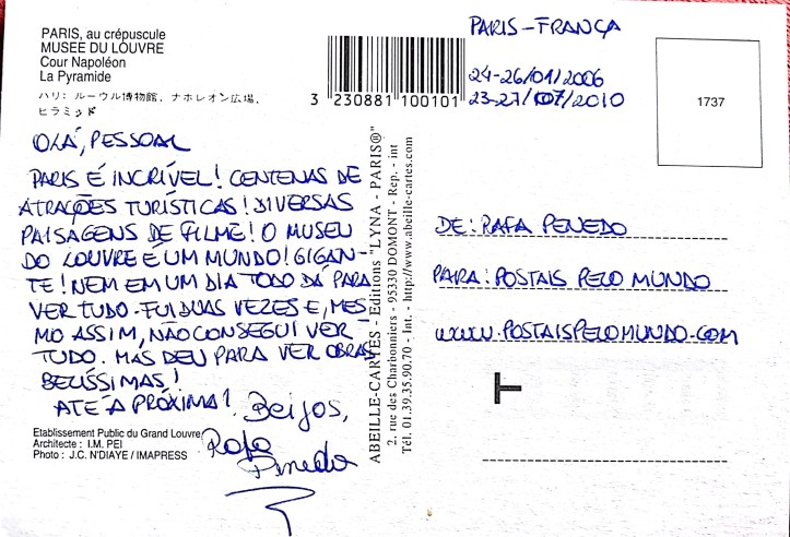 - Museu do Louvre – possui uma das mais importantes coleções de arte do mundo. Primeiro foi construído como uma fortaleza em 1190. Depois foi transformado em palácio, crescendo com cada rei que o ocupava. Tornou-se museu em 1793. Os planos de modernização do Louvre foram iniciadas em 1981, incluindo a transferência do Ministério das Finanças para a entrada principal. Isso tomou forma em uma pirâmide de metal e vidro, que, além de tudo, trouxe mais luz natural para o interior do museu. Em 2006 pagamos €6 pela entrada, mas no passe noturno, que era mais barato, pois tinha menos tempo para a visitação. Já em 2010, compramos o ingresso normal e pagamos €9.5. Passamos de 3 a 4 horas lá dentro em 2010.