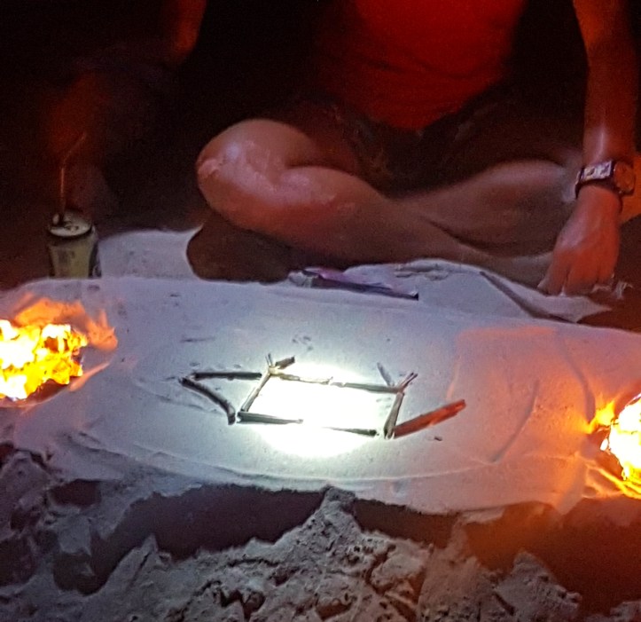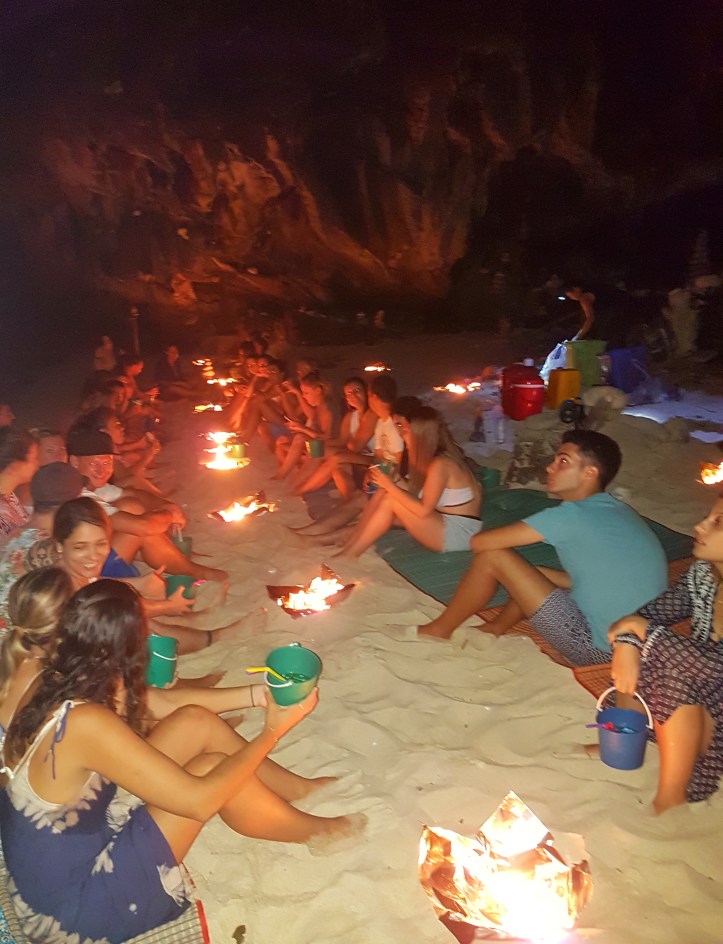 - Bebidas e brincadeiras na praia – depois do mergulho noturno, tiramos um pouco do sal, em um “banho” de bacia, e nos arrumamos para a “festinha”. Cada um ganhou um bucket, baldinho com drink, que podia ser ou de vodka ou de rum tailandês, tendo como mistura Coca Cola ou Sprite. Em seguida, fomos de barquinho para uma praia pequenininha que estava toda iluminada com velas em papéis laminados, dando um belo charme ao lugar. Lá a guia fez brincadeiras para que o grupo se conhecesse e interagisse mais. Havia a possibilidade de comprar mais bebida em um bar que eles improvisaram na areia da praia: 100 Bahts (R$10) a cerveja e 250 Bahts (R$25) o bucket. Ficamos cerca de duas horas por lá.