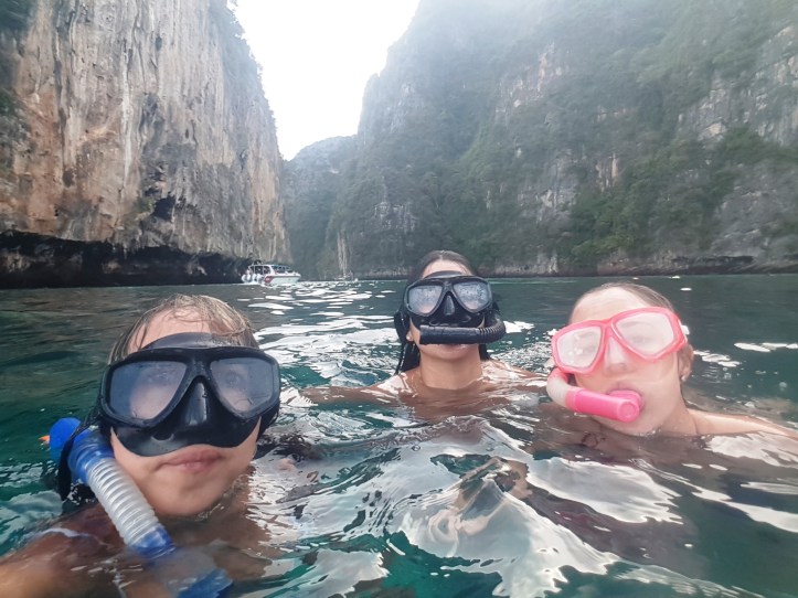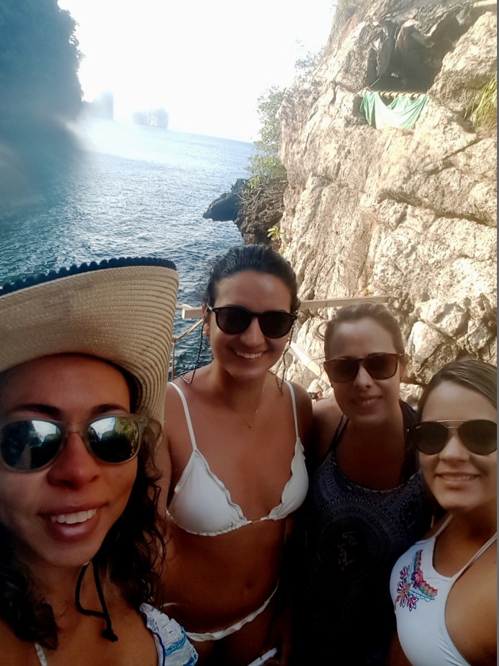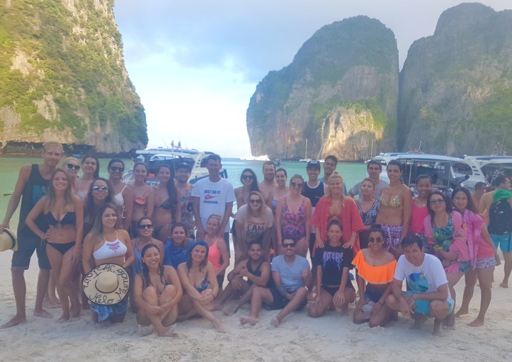 - Amanhecer em Maya Beach – a guia acordou a galera por volta das 06:30 para que todos fizessem um lanchinho rápido (chá, torradinhas e umas bananas) e partíssemos para Maya Beach cedinho, antes da chegada dos demais turistas. E valeu muito a pena! Parecia que tudo aquilo era só nosso! Aproveitamos para fazer várias fotos legais, inclusive a foto oficial do grupo!