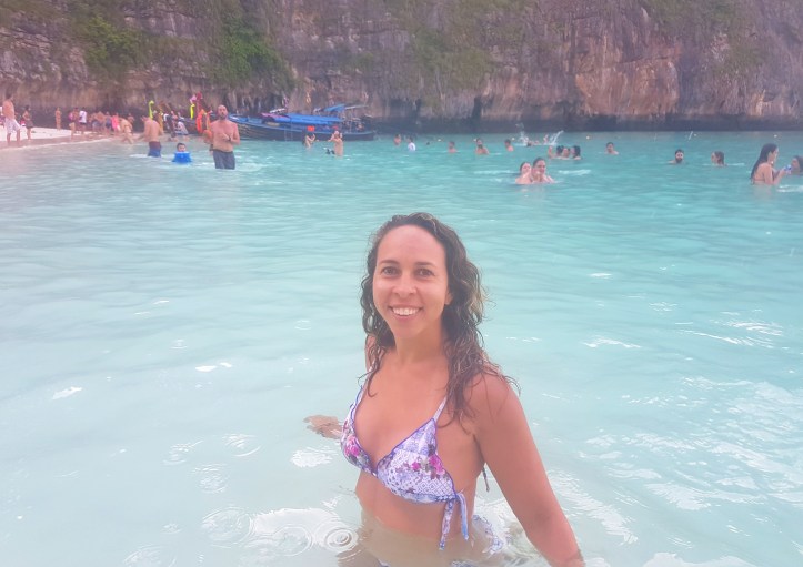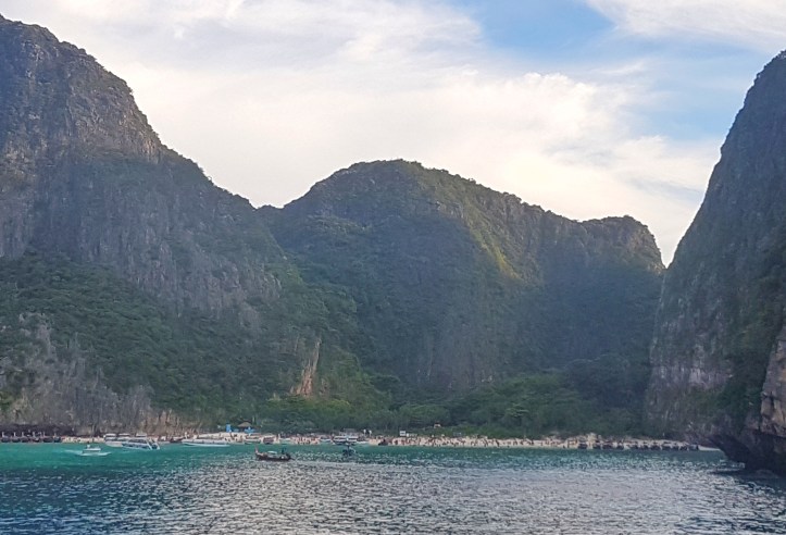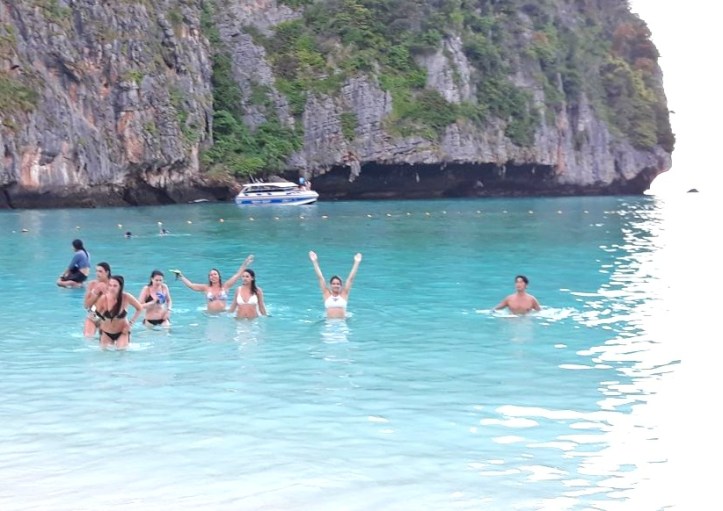 - Maya Beach – uma hora e meia após deixarmos o cais de Tonsai em Phi Phi Dom, chegamos a tão esperada baía: Maya Bay! Lá, nosso barco atracou e os deslocamentos passaram a ser realizados em um barquinho. Após um lanchinho com frutas, chá e água, embarcamos nele e fomos para a famosa praia de Maya Beach.