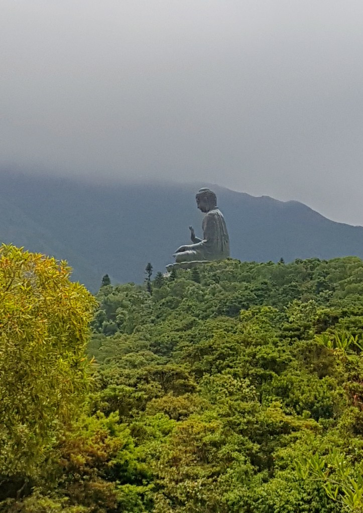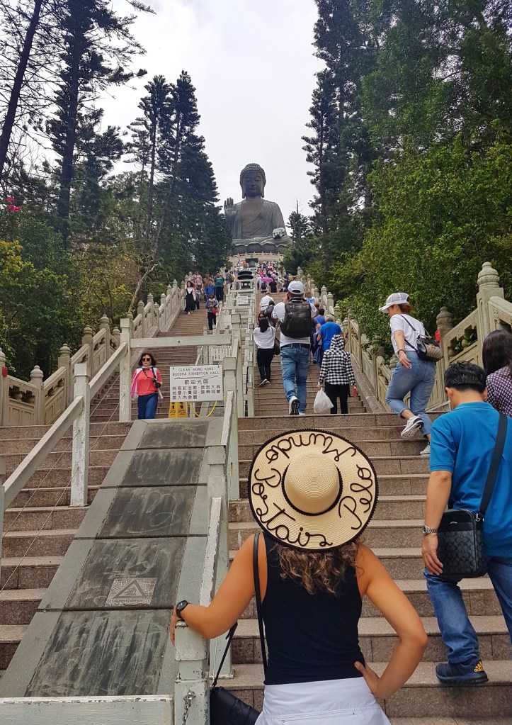 Encaramos os 268 degraus até o escultura de bronze de 34m de altura que fica próxima ao Monastério Po Lin, representando a harmonia entre homem e natureza.