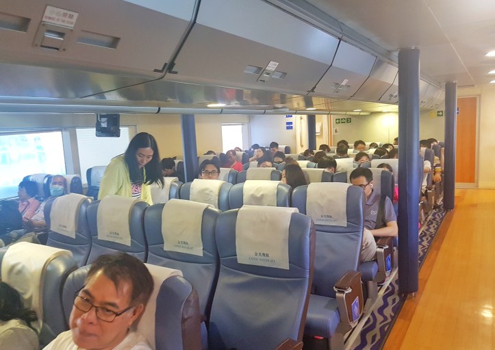 Compramos as passagens na hora no balcão da companhia Cotai Water Jet e custou 400 HKD (Hong Kong dolars) ida e volta para cada uma. Existe ainda outra empresa que faz o trajeto, a TurboJET, mas sua balsa ia sair mais tarde e queríamos aproveitar o nosso tempo. O terminal é bem confortável, semelhante a um aeroporto pequeno.