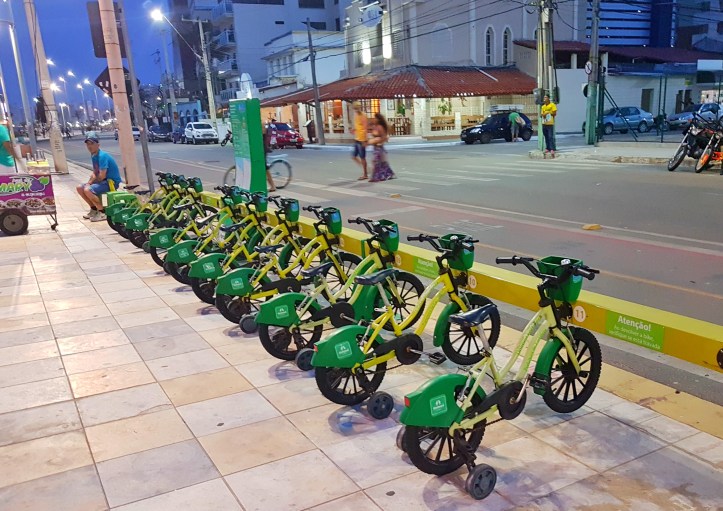 Achei bem legal a iniciativa da Prefeitura, em parceria com a Unimed, em colocar as bicicletas para aluguel ao longo da orla, principalmente pelo diferencial em oferecer bikes infantis, para crianças de até 50kg e 1,50m. Achei o máximo! Para usá-las basta baixar o aplicativo bicicletar, escolher a bicicleta e retirá-la. Até 60 minutos de uso gratuito, após isso, será cobrado o valor de R$5 por hora. Aos domingos e feriados a gratuidade é para até 90 minutos. O mesmo esquema funciona para as bicicletas para os adultos.