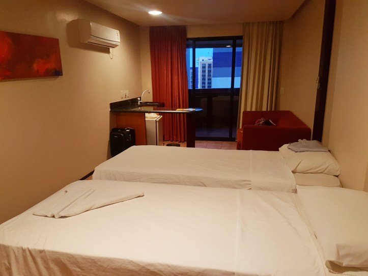 Ficamos hospedadas em no Hotel Plaza Praia Suítes com um ótimo custo-benefício ((R$663,00 por 3 diárias no apartamento duplo), a uma quadra da orla da praia de Iracema. Eles nos deram um up grade de quarto e acabamos ficando em um apartamento com dois quartos, um banheiro e uma ampla varanda.