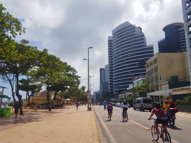 - Avenida Beira Mar – achei bem legal caminhar pela orla da Avenida Beira Mar no domingo, pois estava bem movimentada com ciclistas pela ciclovia, pessoas se exercitando e os turistas passeando. Em alguns pontos não dá pra ver o mar, pois as imensas barracas de praia escondem a paisagem. Saímos da praia de Iracema e fomos andando até a de Meireles.