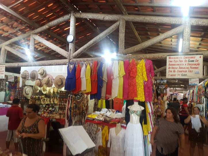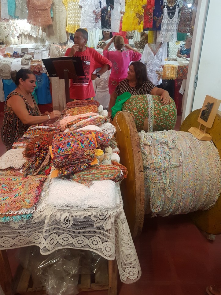 O passeio custava R$40,00 por pessoa, mas como foi o nosso segundo passeio com a empresa, conseguimos um descontinho e acabamos pagando R$ 35,00 cada. A van da Vitorino nos pegou às 08:00 no hotel e, uma hora depois, paramos no Centro de Rendeiras de Aquiraz, onde ficamos por cerca de 45 minutos. Lá tem uma feirinha de artesanato e diversas rendeiras fazendo renda de Bilro.