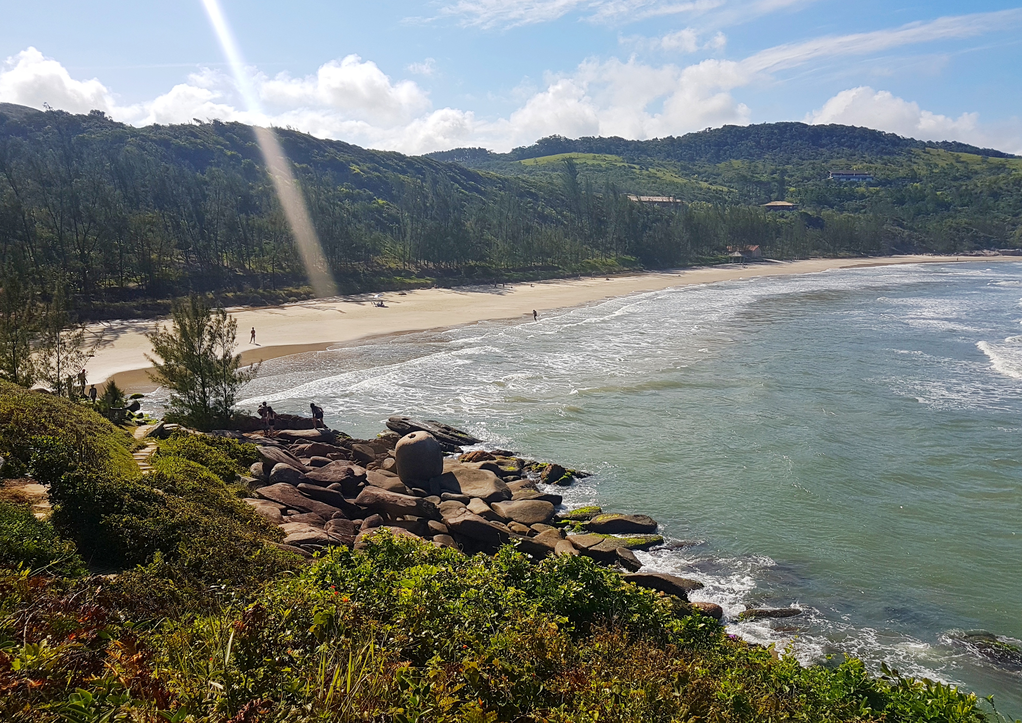 A Praia do Rosa possui praias belíssimas e de águas geladas (o que adoro! ahah). É uma beleza diferente das praias de Maceió, pois elas ficam em meio a rochas, morros e mata, uma mistura perfeita! Em contrapartida, devido a esses três elementos, o acesso a praia não é tão simples, já que é preciso enfrentar subidas e descidas nas trilhas para chegar às praias. É possível chegar de carro a algumas delas, como Rosa Sul, por exemplo, porém terá que encarar os estacionamentos caros, principalmente na alta temporada. Como eu não estava com carro, coloquei “sebo nas canelas” e encarei as trilhas que, por sinal, eram bem bonitas!