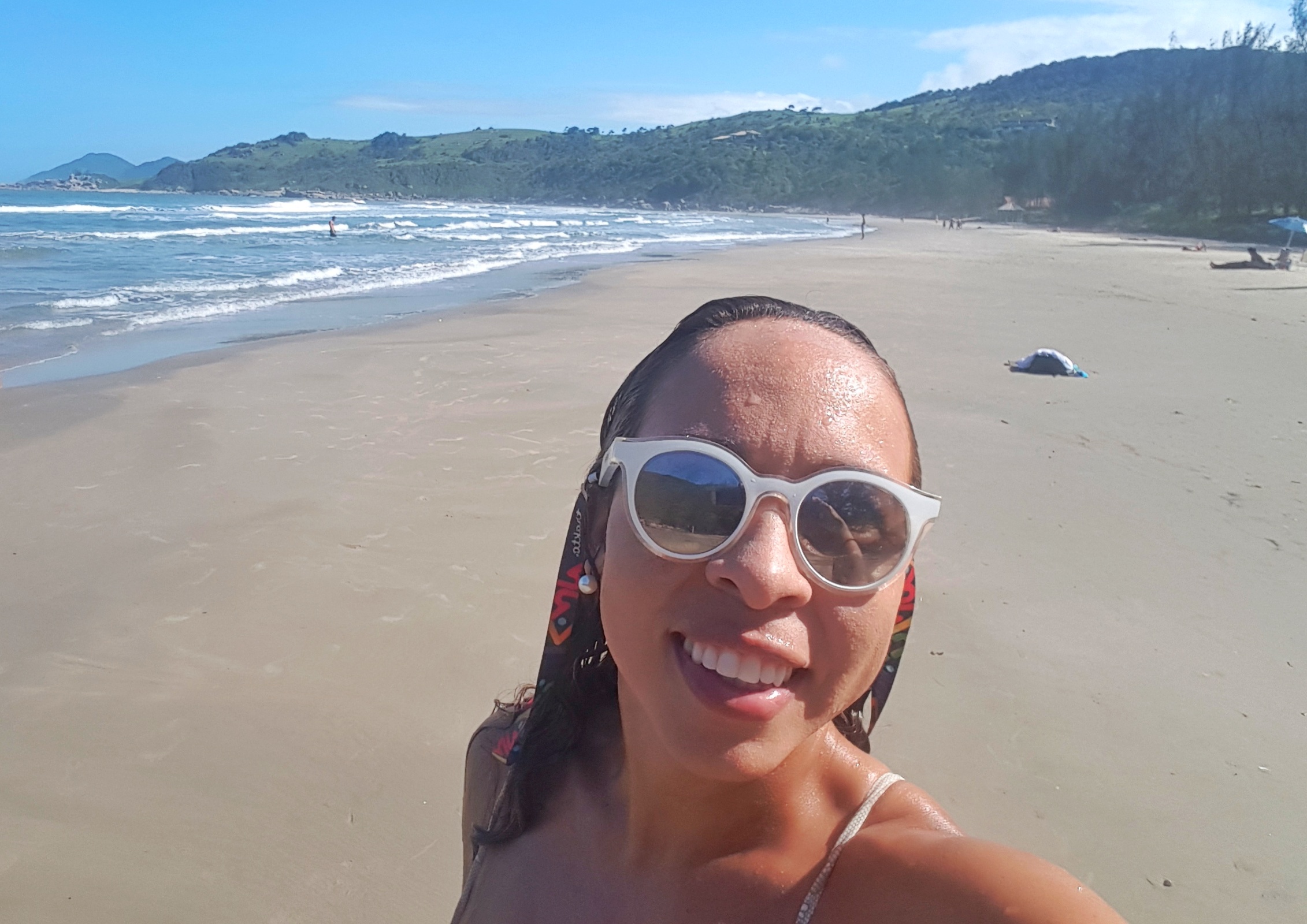 Ao sair da trilha, já chegamos à areia da praia, que é totalmente diferente da Rosa Norte e da Rosa Sul. Como o acesso de carro é bem fácil, muitos utilizam seus veículos para ir para lá e os estacionam na areia, o que eu não curto muito. A areia da praia é mais escura um pouco, o que altera também a cor da água. Estava ventando muito, por isso não animei de ficar na areia curtindo a praia.