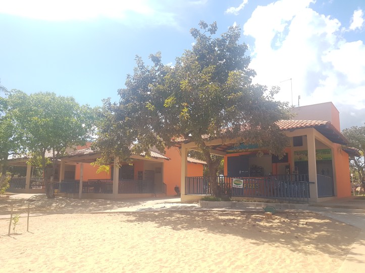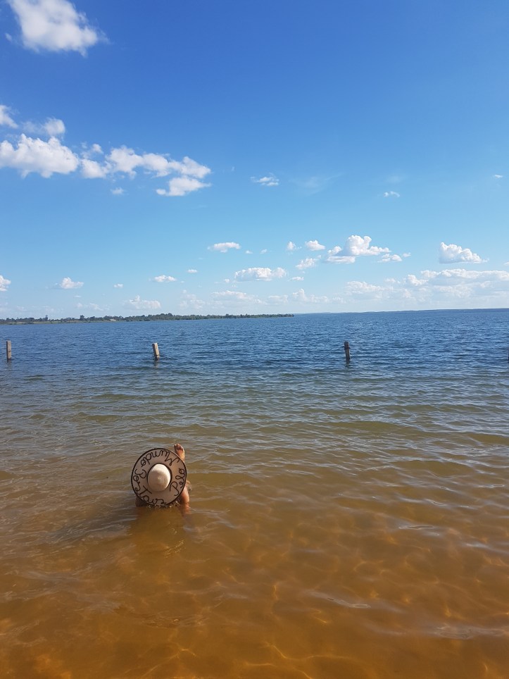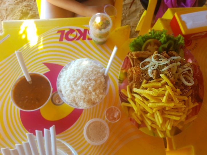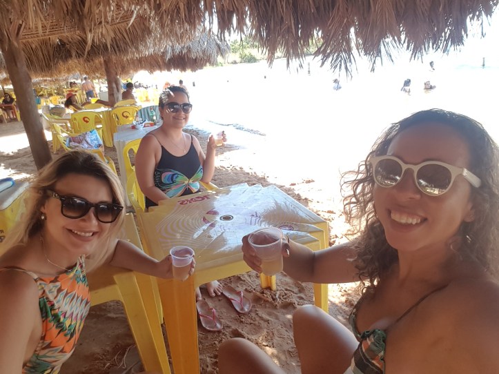 O calor foi tanto que fugimos para a praia! Isso mesmo! Palmas não tem mar, mas tem várias praias de rio. Escolhemos a Praia do Cajú. Fomos de Uber e levamos cerca de 20 minutos, desde o Hotel, com direito a 2km de estrada de chão, para relembrar o Jalapão! Lá têm vários restaurantes com mesas bem pertinho da água. Escolhemos um aleatoriamente e sentamos para curtir a tarde com uma cervejinha e uma peixada frita de Tucunaré. O banho estava uma delícia!