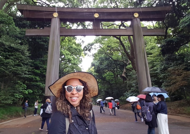 - Santuário Meiji – a primeira atração turística que visitamos na capital japonesa foi um local que destoa completamente da agitada metrópole pela paz e sossego. O santuário fica dentro de um parque imenso, o Parque Yoyogi, no bairro de Harajuku, e é repleto de verde, pássaros e com paisagens belíssimas. A caminhada desde o portal de entrada (entramos pela que fica mais perto da estação de metrô Meiji-jingumae) até o santuário, por dentro do parque é super agradável! Pena que a chuva não permitiu que explorássemos melhor o parque.