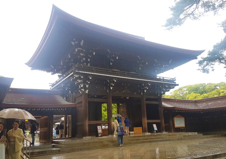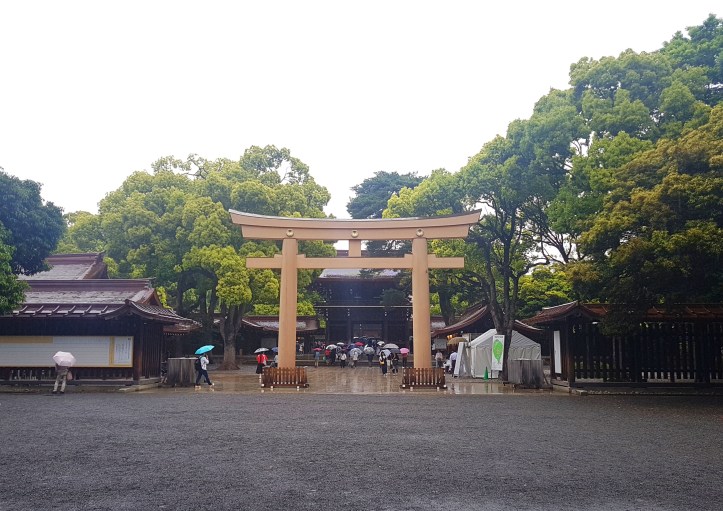 Na entrada do santuário, atravessamos mais um belo Torii (portal) e nos deparamos com um lindo complexo de templos xintoístas, dedicado ao Imperador Meiji. Ele foi construído em 1920, destruído na 2ª Guerra Mundial e reconstruído no final da década de 1950.