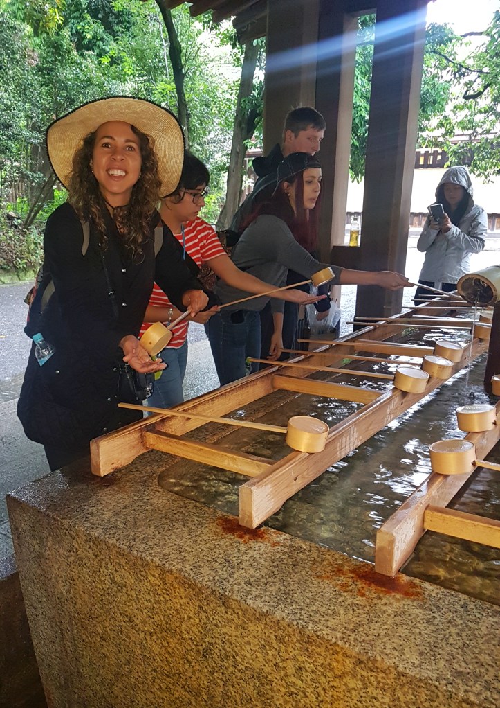 Como em todos os templos japoneses, deve-se lavar as mãos antes de entrar, em sinal de respeito. Por isso, todos possuem uma Temizuya, uma fonte com conchas para ajudar os visitantes na purificação.
