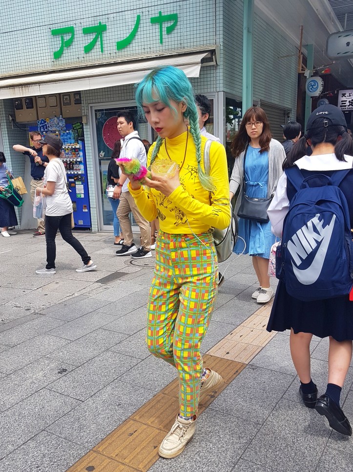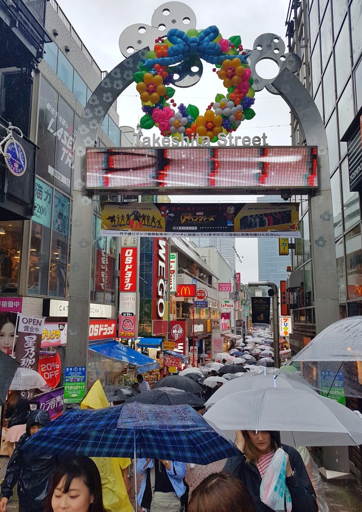 - Rua Takeshita – aproveitamos que estávamos em Harajuku para visitar a famosa rua Takeshita, famosa por ser muito movimentada e pelas pessoas vestidas como nos desenhos animados (cos players). A primeira imagem que tivemos foi de um “mar de guarda-chuvas” em meio àquela estreita rua cheia de letreiros luminosos! Não conseguimos passar muito tempo por lá, pois não estava nada legal ficar esbarrando o tempo todo nos guarda-chuvas do povo. Mas deu para entrar em algumas lojinhas e encontramos uma japonesinha com look típico da cultura pop do país, com seus cabelos azuis. Infelizmente não achamos nenhum cos player.