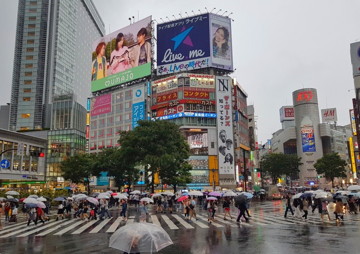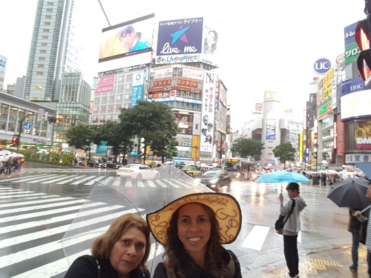 Após uma hora de trem saindo de Saitama, chegamos a Tóquio, onde fomos recebidas por muita chuva, o que não nos impediu de bater perna pela cidade. Compramos um guarda-chuva e saímos explorando a cidade. A chuvinha deu até um charme a mais ao passeio!