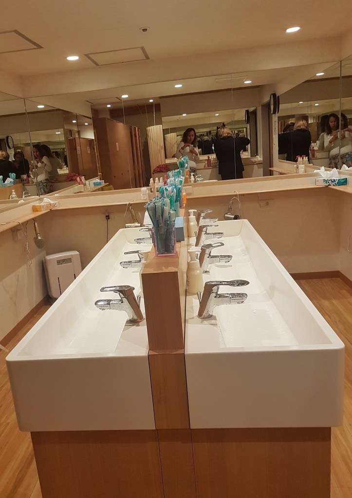 Mas fiquei mais impressionada com o banheiro compartilhado do andar das mulheres. Um luxo e mega limpo! Além disso, ele é equipado com tudo que você precisa: escova de dente descartável que já vem com pasta, shampoo, condicionador, sabonete líquido, hidratante para corpo, sabão para lavar o rosto e secadores de cabelo. Detalhe! Os cosméticos eram todos de primeira, da marca Shiseido!
