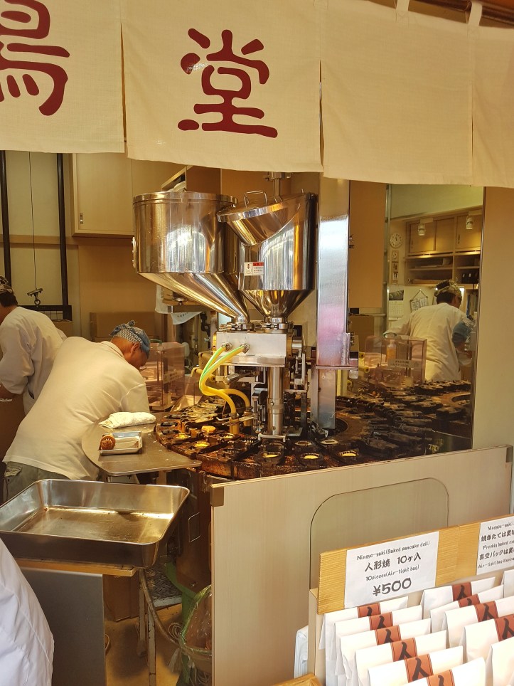 Entre as lojinhas de souvenir encontramos quiosques vendendo deliciosos bolinhos típicos com recheios diversos. É o “alfajor” deles. Infelizmente, não encontrei o que buscava, com recheio de chocolate, como o que provei em Hiroshima. Mas provei um com recheio de feijão japonês feito na hora e estava muito bom também! O legal é que a preparação é feita para todos verem.