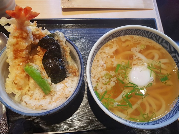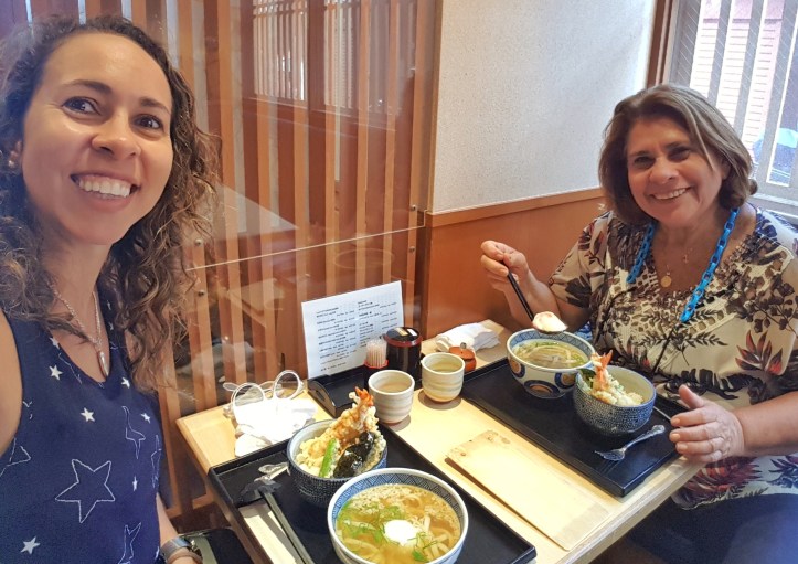 Outra experiência gastronômica marcante foi o almoço no bairro de Asakusa. Após um tempão procurando um lugar para comer em uma rua repleta de restaurantes com letreiros em japonês, resolvemos entrar em um deles e fomos surpreendidas com uma deliciosa refeição, com destaque para a tempurá de camarão.