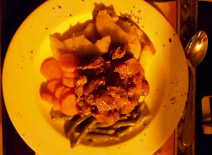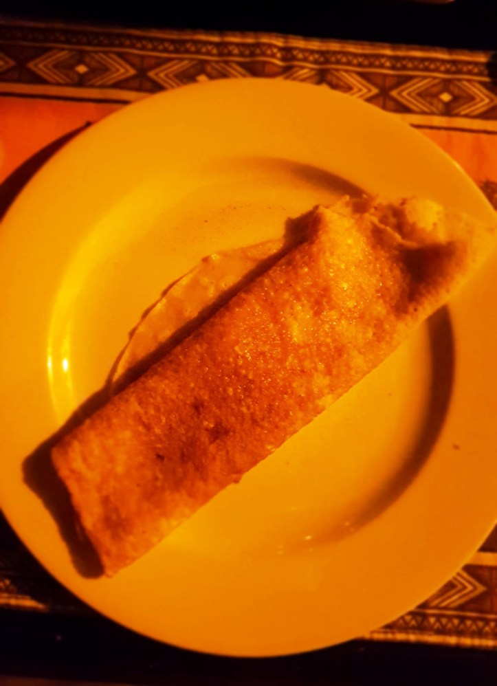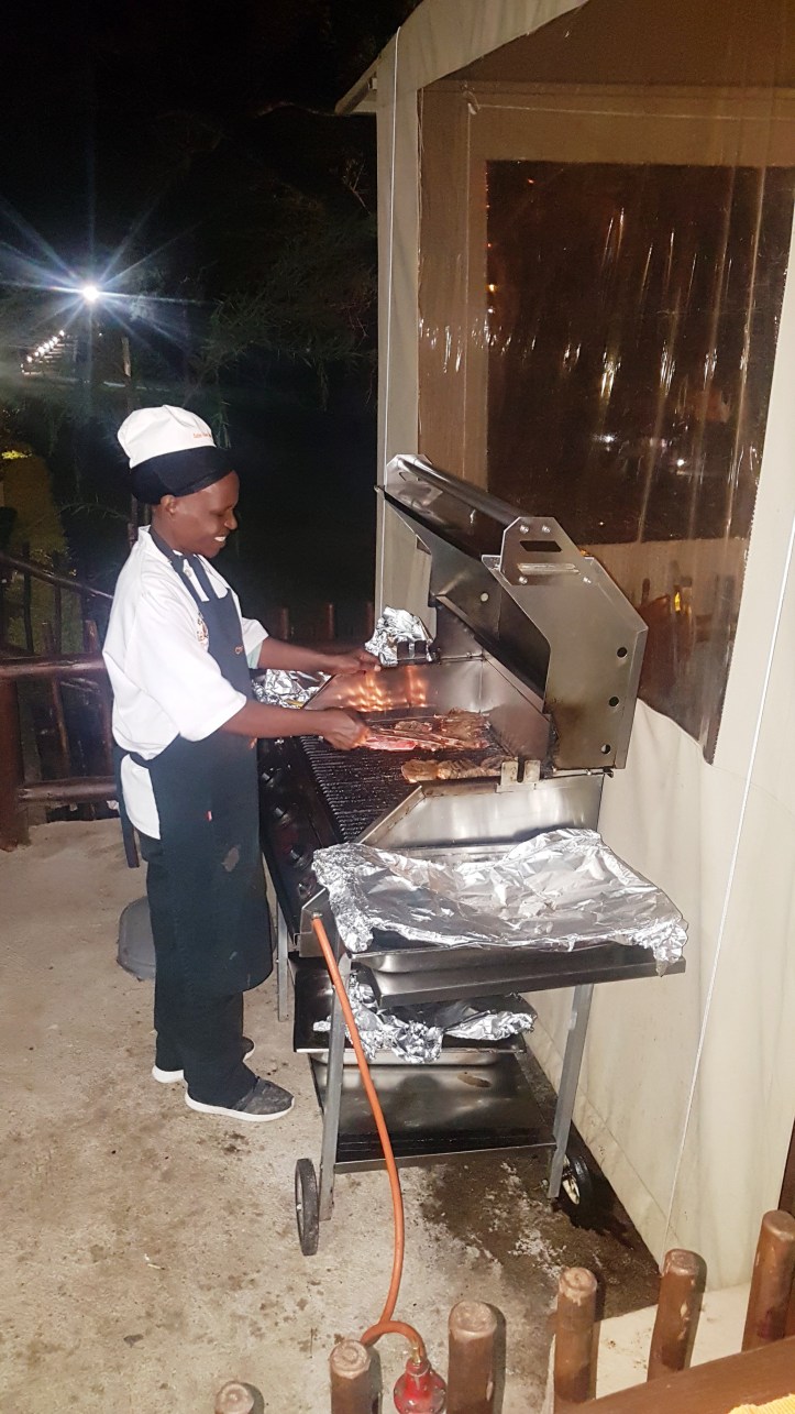 O jantar da nossa segunda e última noite no Lodge foi um menu com três opções de entrada, três de prato principal e duas de sobremesa. Na entrada eu comi legumes envoltos no bacon com redução de balsâmico, como prato principal fui de carne de koodoo guizada com purê de batatas, arroz e legumes, e, para sobremesa, pedi crepe suzete com sorvete. Estava tudo delicioso!