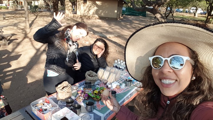 O café da manhã estava incluso no passeio e foi em uma área de pic nic dentro do acampamento Skukuza, um lugar bem agradável dentro do parque. Ficamos surpresas com a falta de educação do guia, pois éramos 5 mulheres (eu, minhas 2 amigas e 2 espanholas) e o guia nos colocou para carregar as caixas de comida. Chegando à mesa, pegou a comida dele e saiu. Tivemos que limpar tudo depois e levar de volta para o carro.