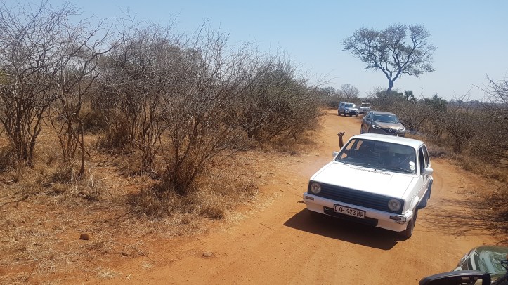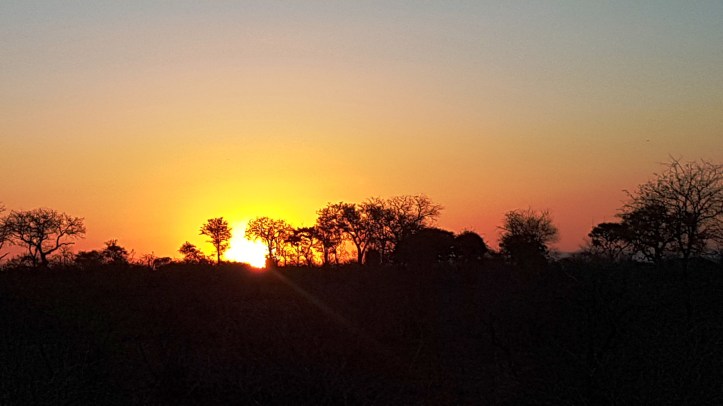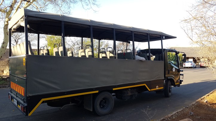 Havíamos reservados dois safáris, sendo um do pôr do sol (das 18:00 às 20:00) e outro do dia todo (das 05:30 às 15:30). Então, logo após o check in, seguimos para o primeiro deles. Dirigimos mais 19km até o portão do Kruger Park, onde nos juntamos a outras pessoas e seguimos para o safári no carro do parque (capacidade para 23 pessoas).