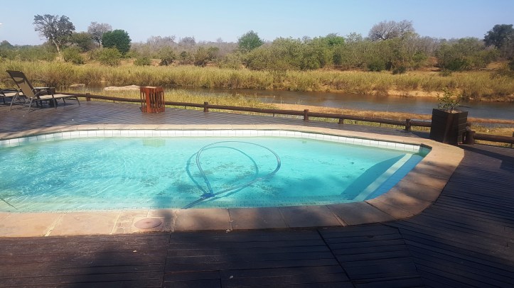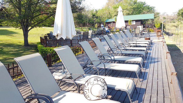 Piscina do lodgeEspreguiçadeiras no deck com vista para o rio Sabie