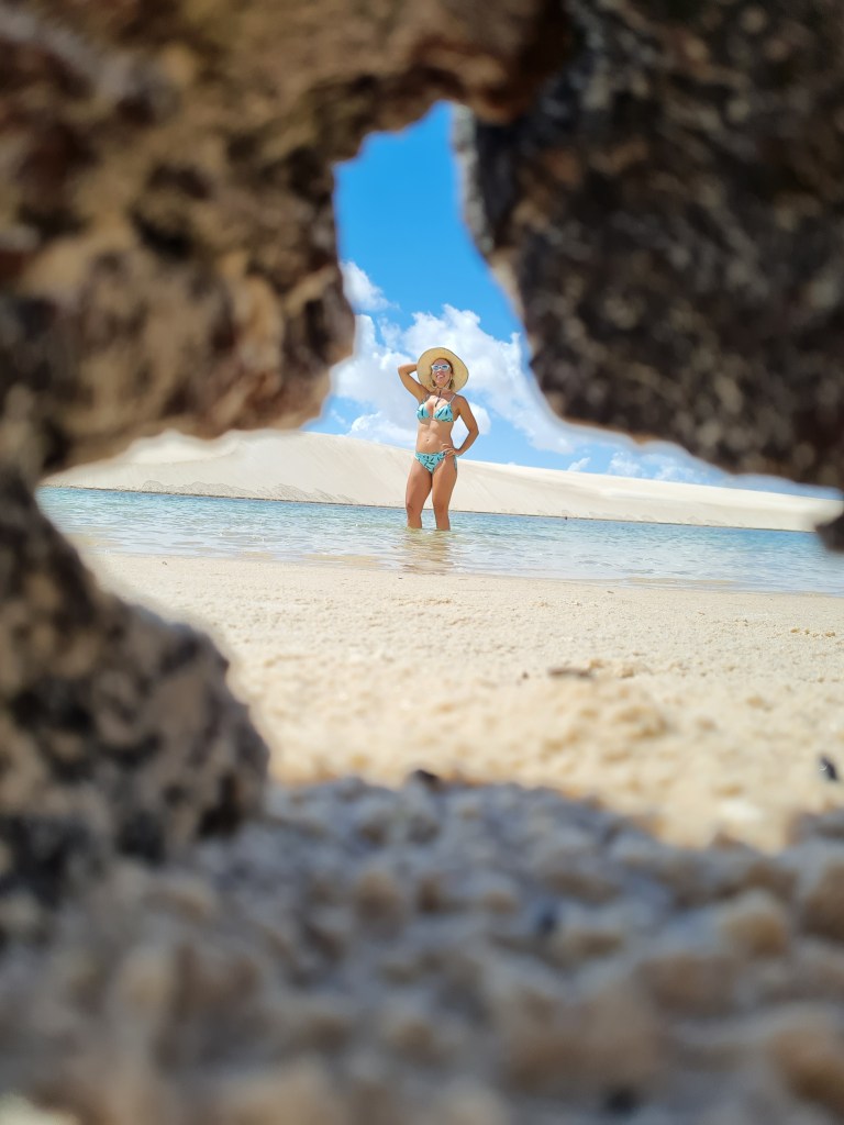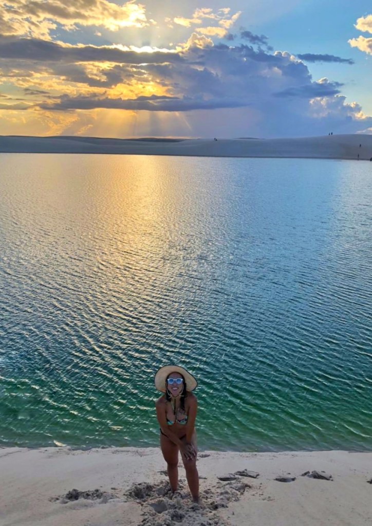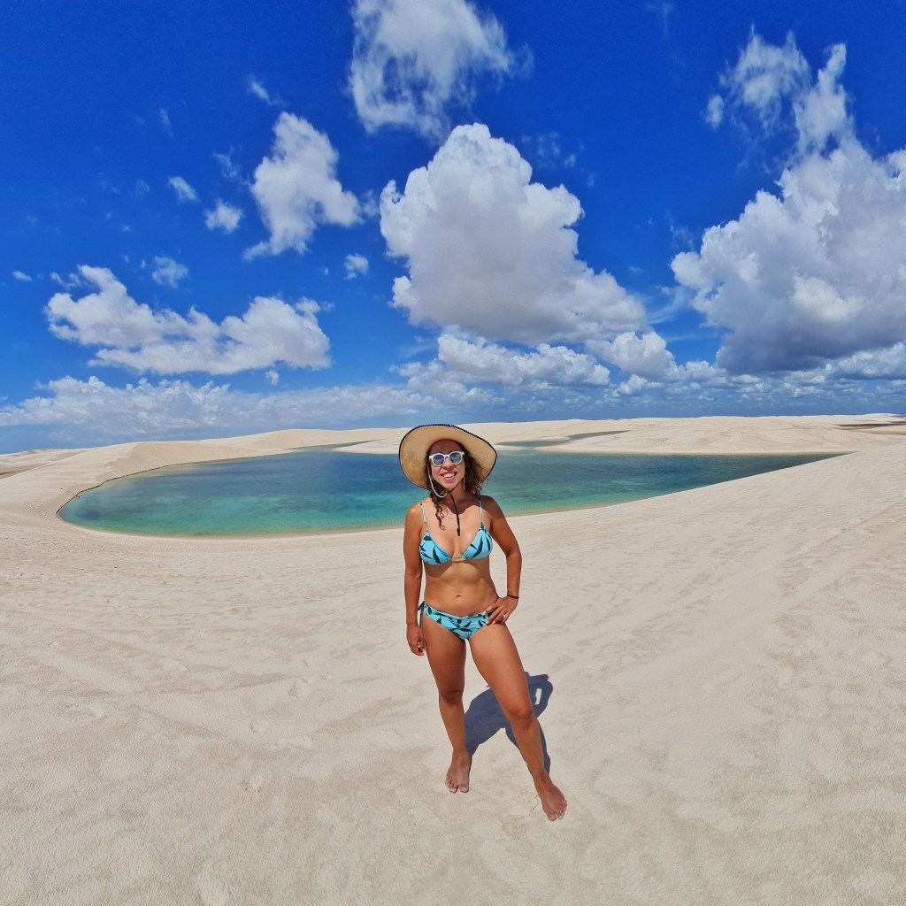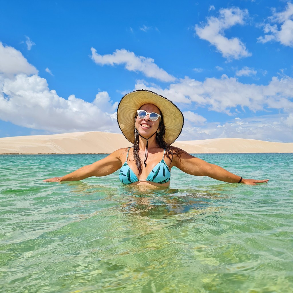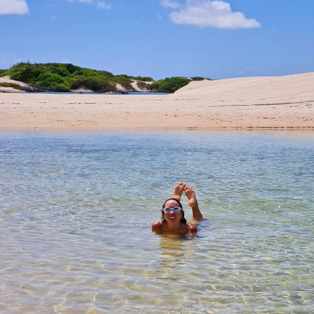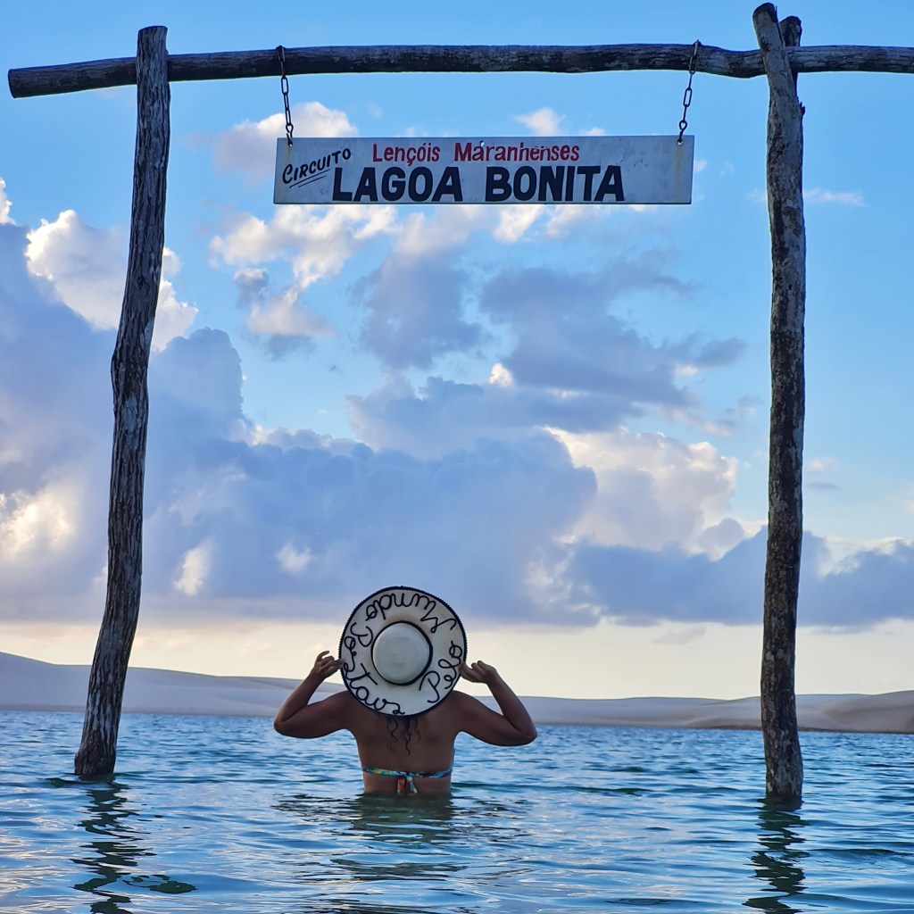 Nosso primeiro passeio começou com cerca de 1 hora chacoalhando em uma jardineira pelo Parque Nacional dos Lençóis Maranhenses. A primeira parada foi na Lagoa do Maçarico. Foi paixão à primeira vista! Fiquei maravilhada!