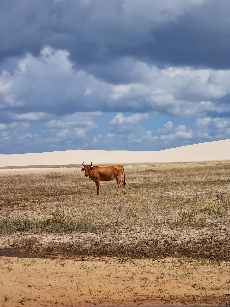 O deslocamento pelas dunas é feito de jardineira e, pelo caminho, em meio àquela imensidão de dunas com areia branca e de belíssimas lagoas, fomos surpreendidas com uma cena bastante interessante: gado pastando em um lugar que parecia uma lagoa que havia secado.