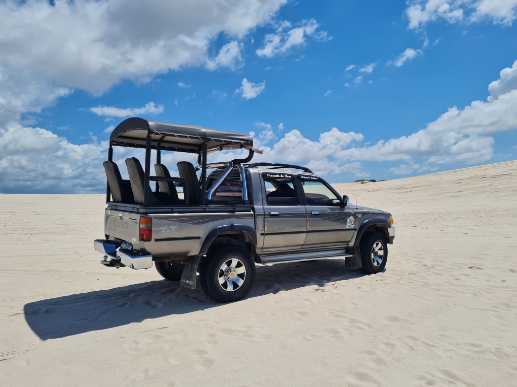 A agência me pegou no hotel e me levou para o ponto de partida do quadriciclo, ainda em Barreirinhas. Como eu estava sem dupla, fui com o guia, alternando a direção com ele. Fomos à praia de Caburé passando pelas dunas do Parque Nacional dos Lençóis Maranhenses. Muito legal pilotar pelas imensas montanhas de areia! Diversão garantida!