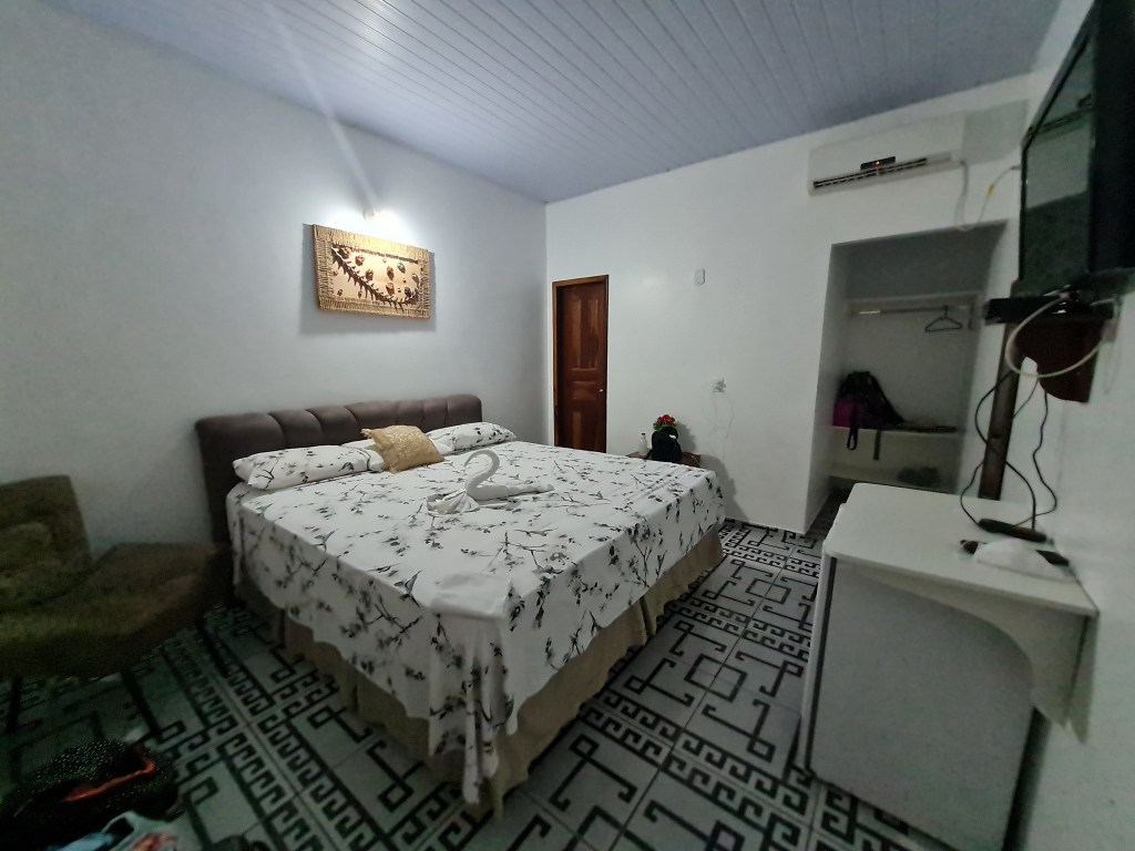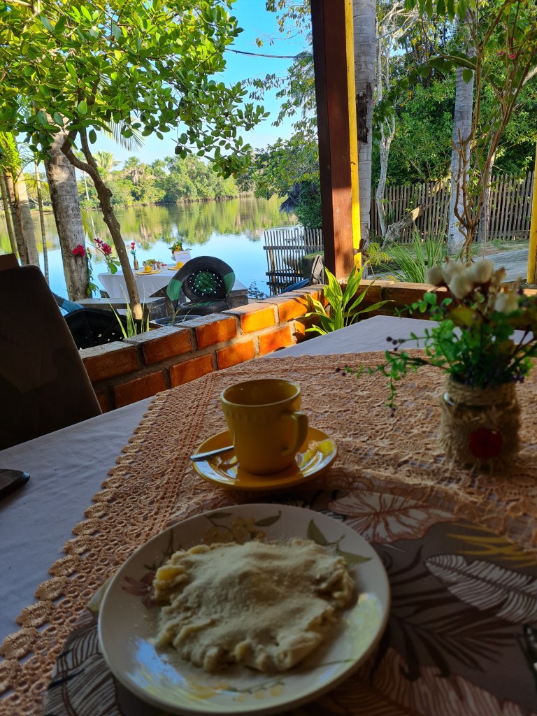 Como contei no início, minha estadia em Barreirinhas, nos Lençóis Maranhenses, foi dividida em duas: na companhia da minha amiga Tati e sozinha. Na primeira parte, com a Tati, ficamos hospedadas numa pousada às margens do rio Preguiças, a Chalé Marinas. O quarto era bem amplo, com uma cama imensa. Os funcionários super simpáticos e prestativos. Mas o que mais gostei foi o café da manhã, não somente a variedade e a qualidade das comidas, como o ambiente e a vista do rio. Ela fica um pouco mais afastada do centrinho, cerca de 10 minutos de caminhada. Mas alguns restaurantes oferecem transporte gratuito.