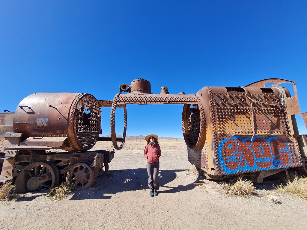 No primeiro dia, ficamos pelo entorno de Uyuni, para onde retornaríamos para dormir. A primeira parada foi no Cemitério de Trens, distante cerca de 10 minutos do centro da cidade. Segundo o guia, os trens foram desativados entre as décadas de 70 e 80. Hoje ainda passa um trilho de trem de carga que vai até o Chile.