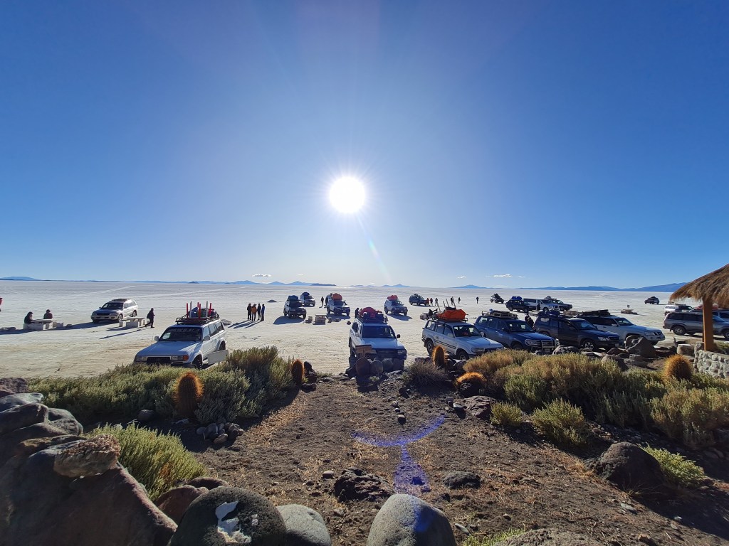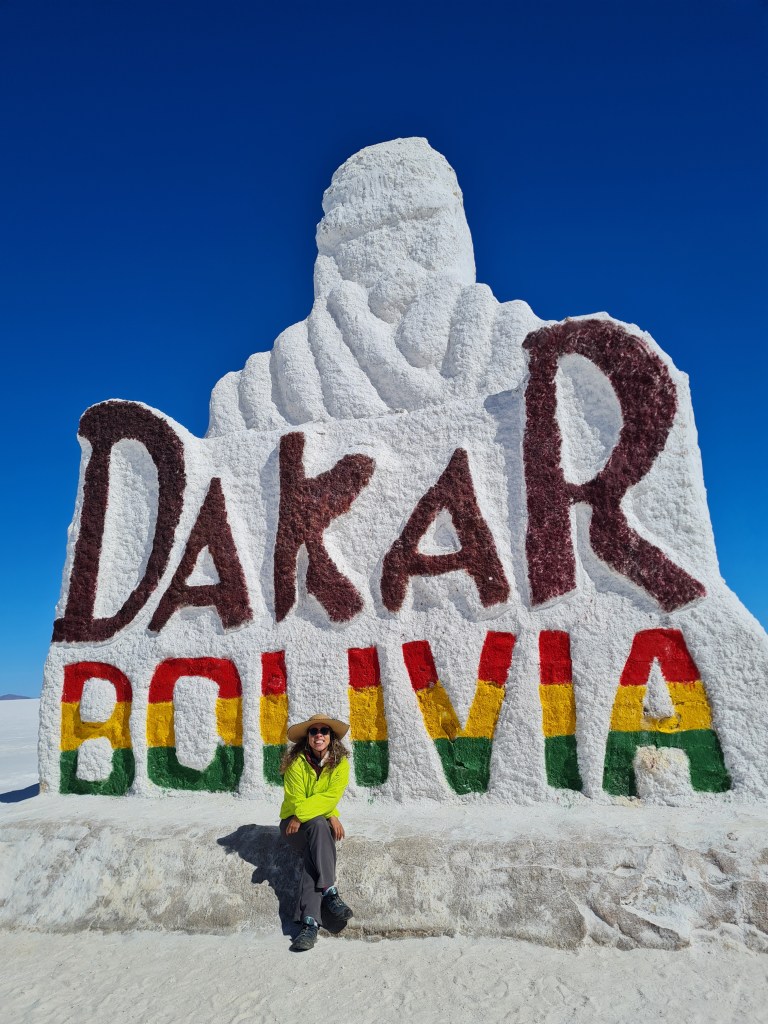 Seguimos por aquela imensidão de sal até chegar à placa do Rally Dakar Bolívia, monumento em homenagem à famosa competição de carros que passa por lá. Tem também um local com bandeiras de diversos países, além de um restaurante de sal, onde várias excursões param para almoçar, mas o nosso guia escolheu um lugar mais especial.