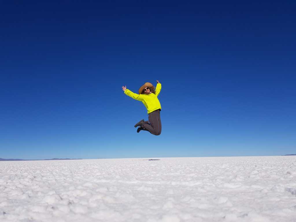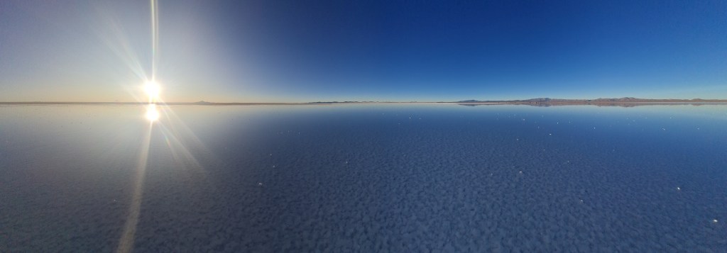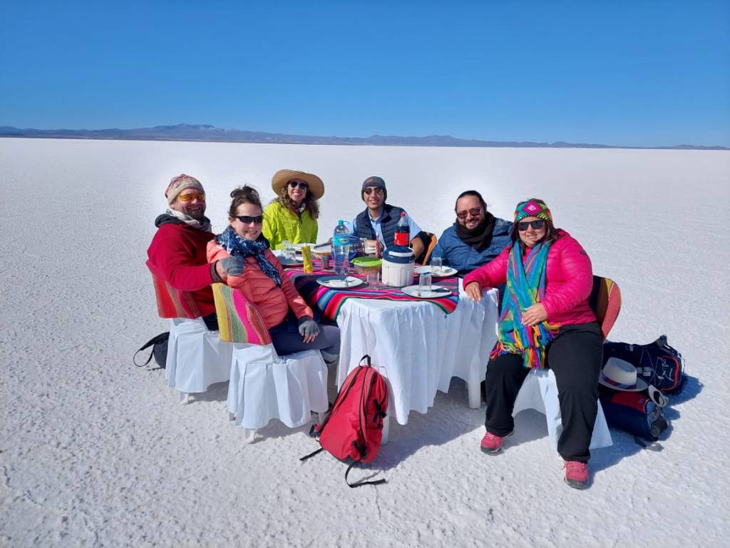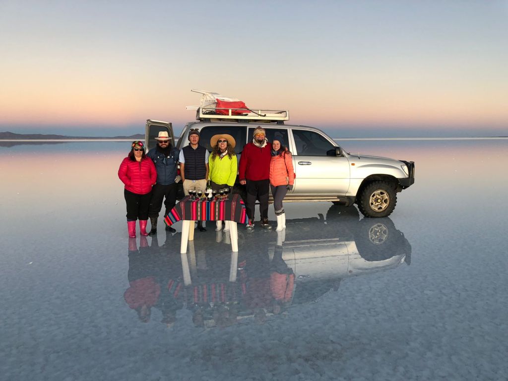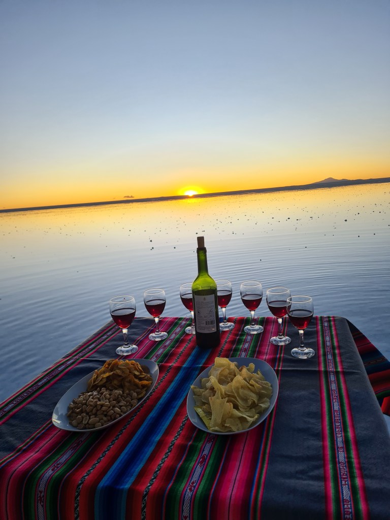Apesar de ser a época de seca, demos sorte a ainda tinha uma parte do deserto com lâmina de água, formando um imenso espelho! O visual é sensacional, principalmente no pôr do sol. Foi incrível! A agência nos entregou galochas para caminharmos pela água. Fomos surpreendidos pelo guia que montou uma linda mesa com petiscos e vinho pata admirarmos o pôr do sol. Que dia!